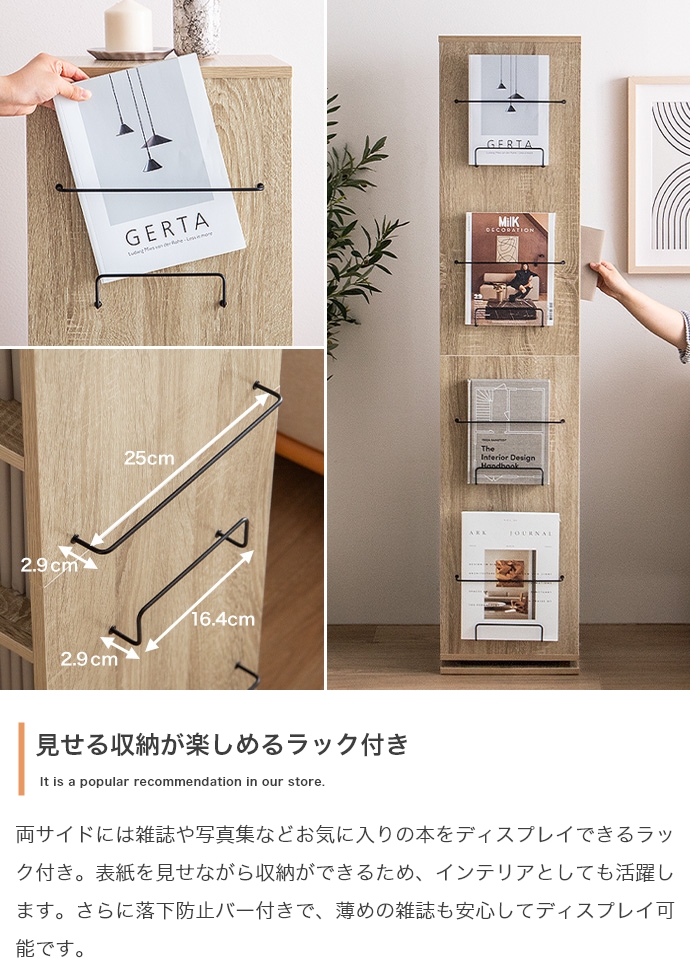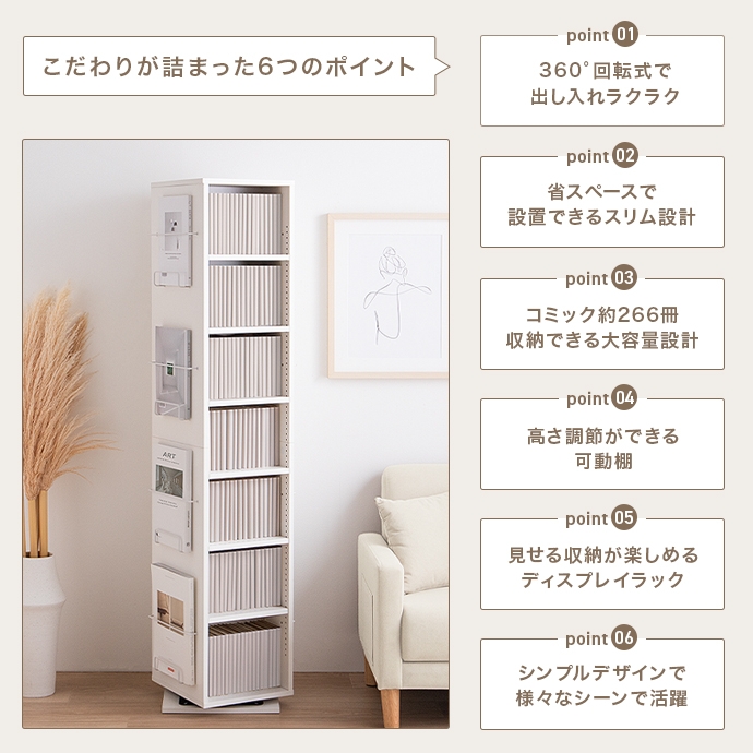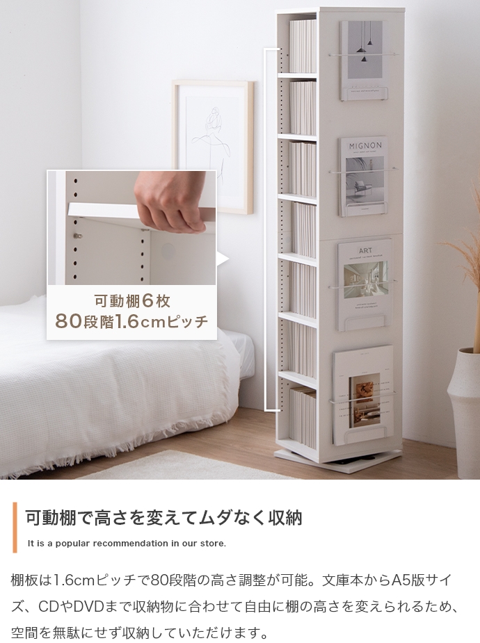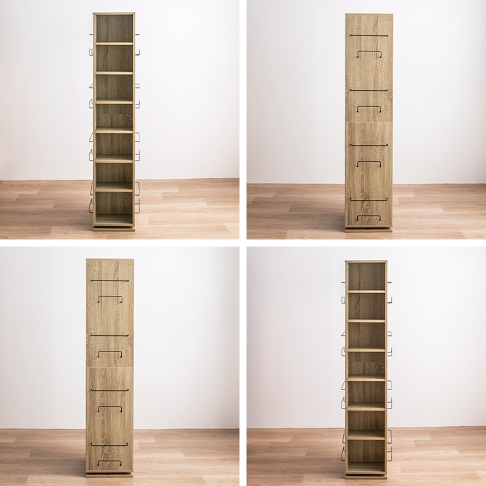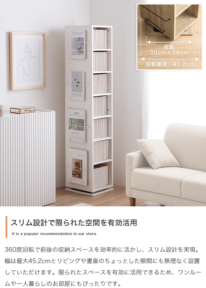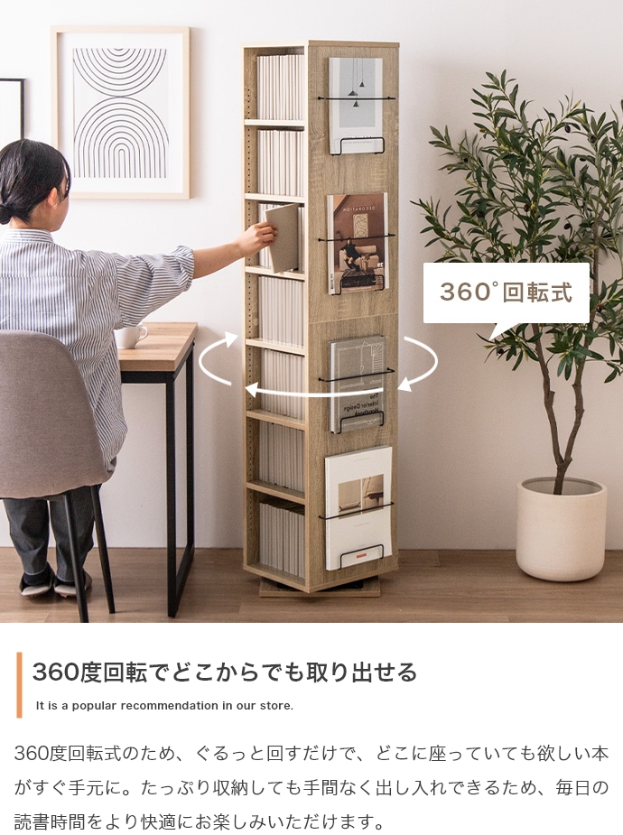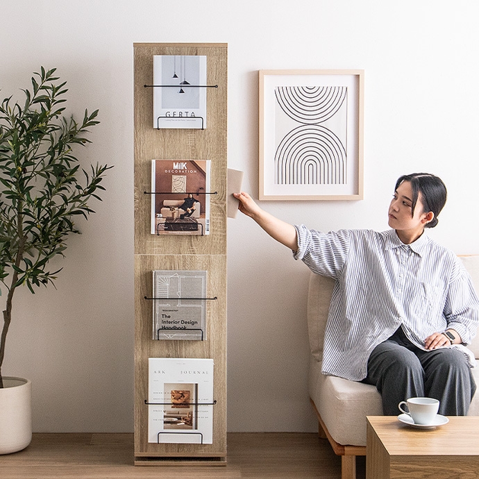 どこからでも出し入れできる360度回転式の『Libro(リブロ)』ブックシェルフ。前後に棚、両サイドにディスプレイラックを備えた4面設計で、収納力抜群。またスリムサイズで限られたスペースにも置け、お気に入りの本や雑誌を整理しながら、見せる収納もお楽しみいただけます。さらにシンプルなデザインと使いやすいサイズ感で置く場所を選びません。リビングや寝室、ワークスペースなど、様々なシーンで活躍します。