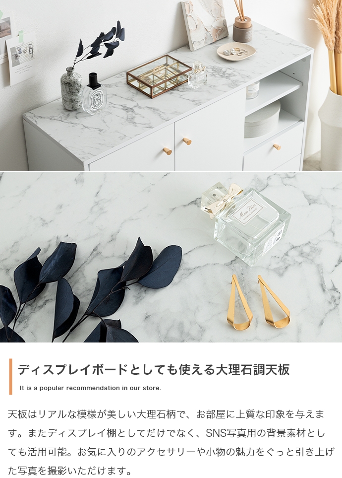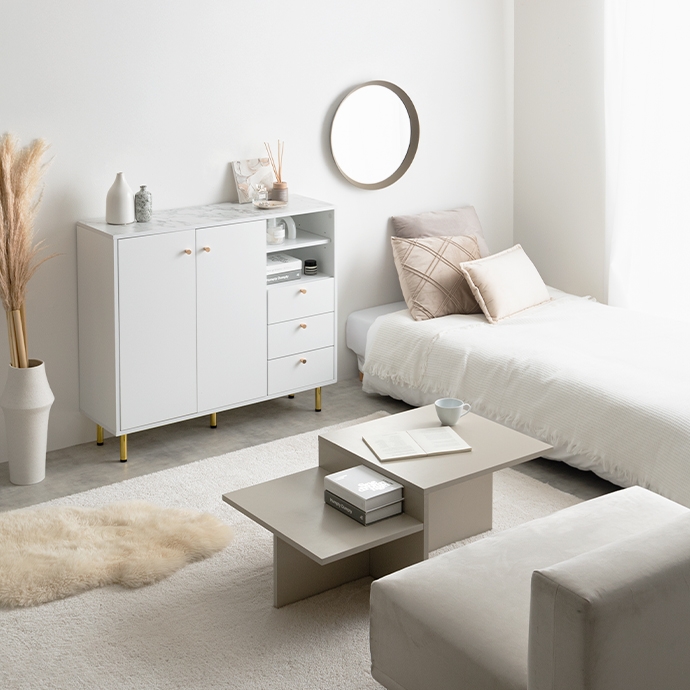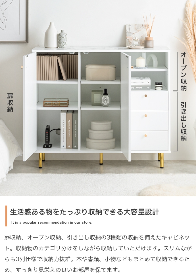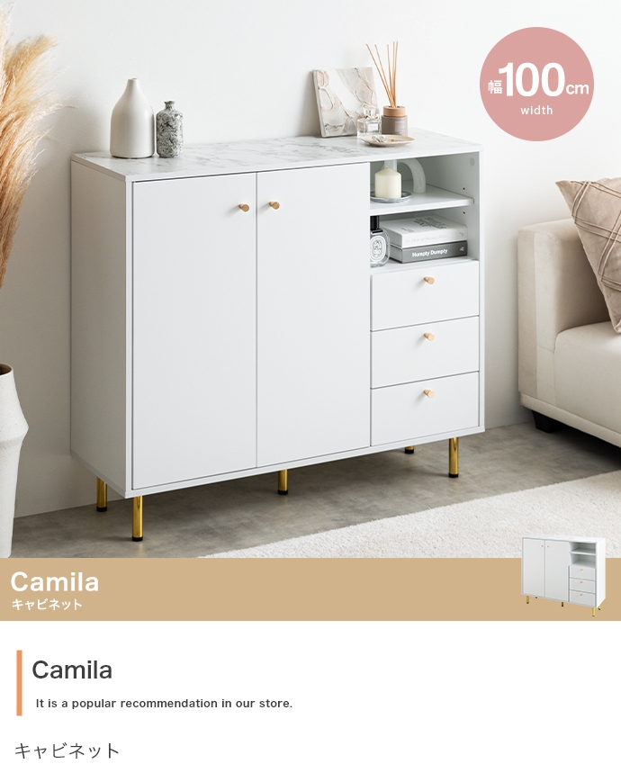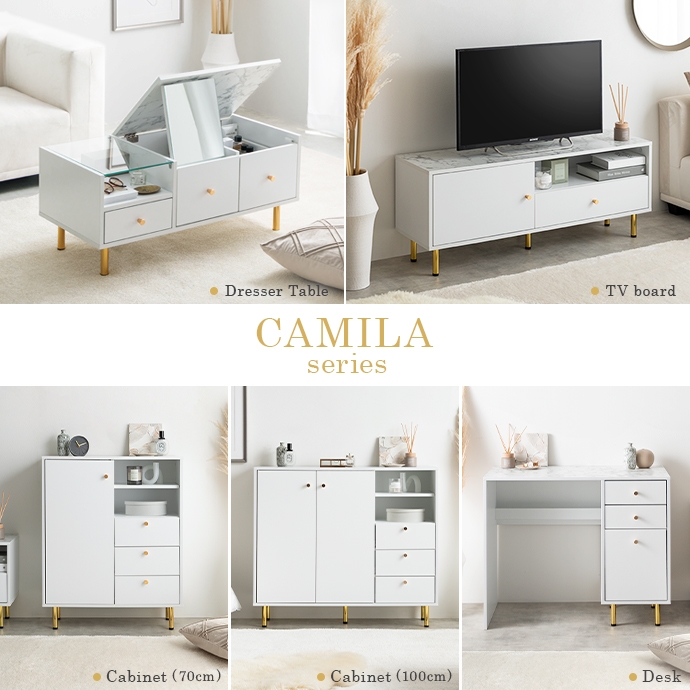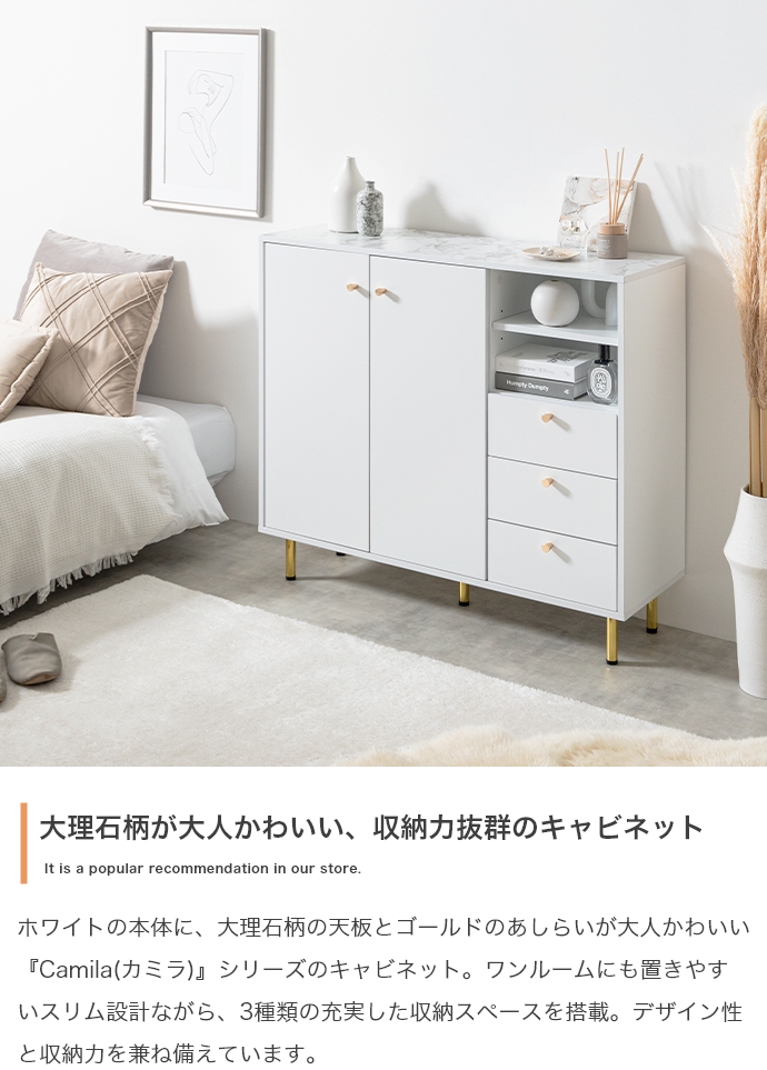 天板の大理石柄とゴールドのあしらいが特徴の『Camila(カミラ)』シリーズのキャビネット。大人かわいいデザインの本体とスタイリッシュなゴールド脚付きで、置くだけでお部屋の雰囲気を高めてくれます。3つの収納スペースと背面のケーブル穴で、ごちゃつきがちな雑貨や雑誌、LANケーブル類などもスマートに整理でき、生活感がなく美しい空間を実現可能です。また奥行は約34.4cmとスリム設計のため、一人暮らしやワンルームなど限られたスペースにもすっきり置いていただけます。