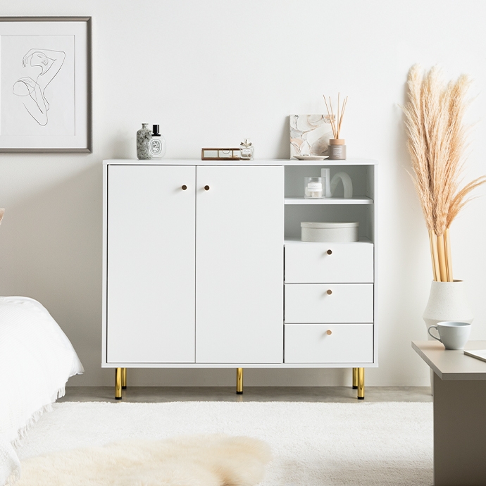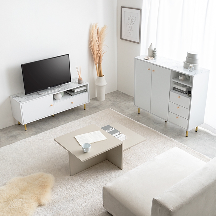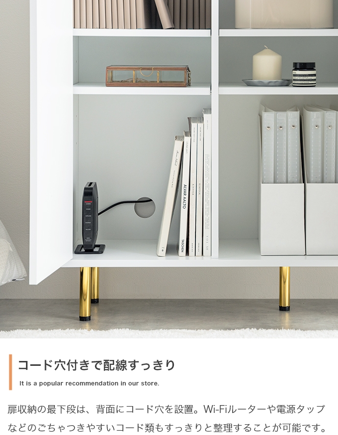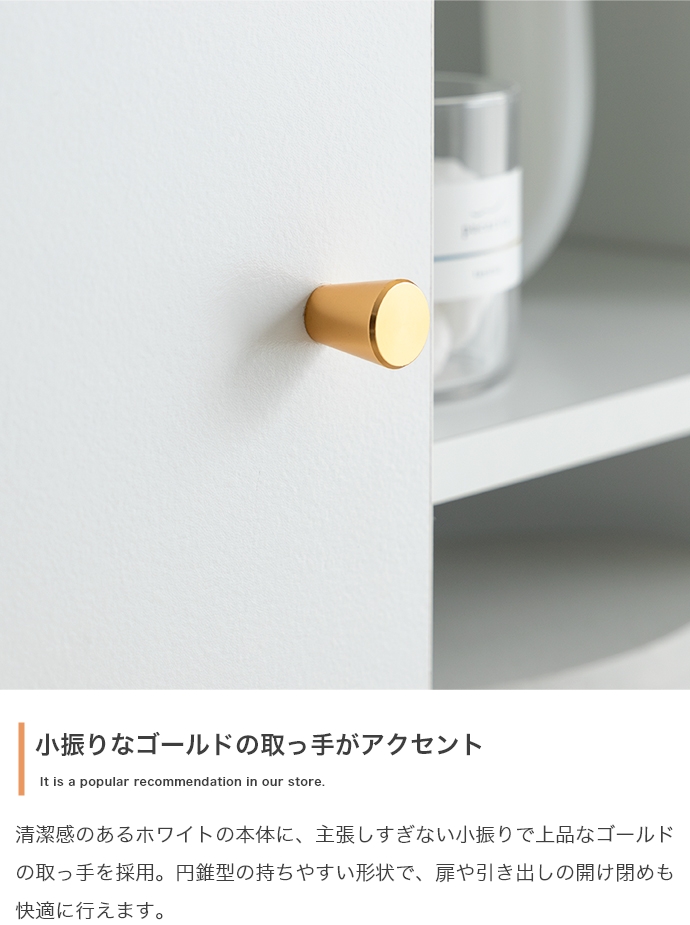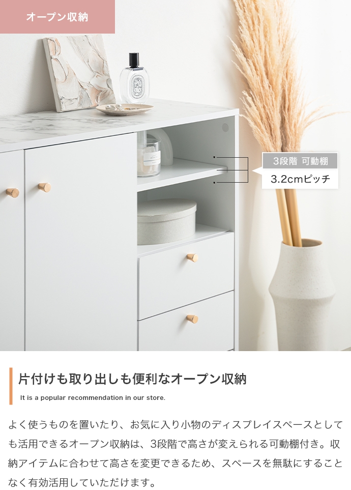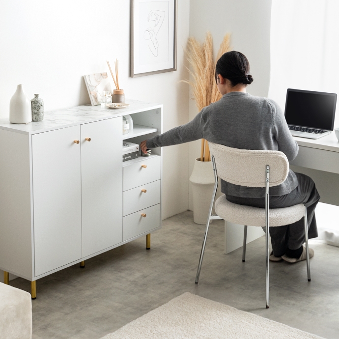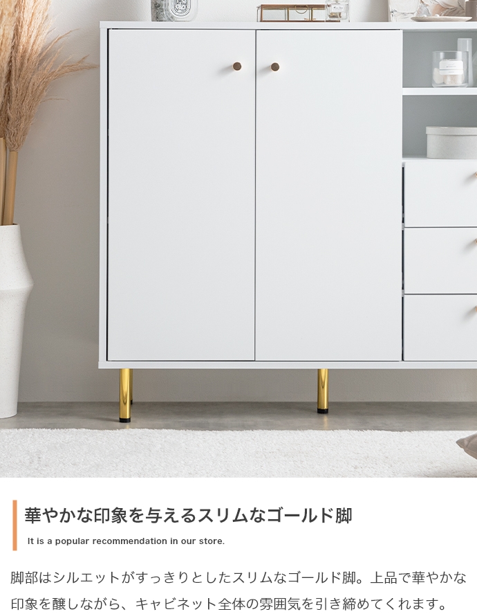 天板の大理石柄とゴールドのあしらいが特徴の『Camila(カミラ)』シリーズのキャビネット。大人かわいいデザインの本体とスタイリッシュなゴールド脚付きで、置くだけでお部屋の雰囲気を高めてくれます。3つの収納スペースと背面のケーブル穴で、ごちゃつきがちな雑貨や雑誌、LANケーブル類などもスマートに整理でき、生活感がなく美しい空間を実現可能です。また奥行は約34.4cmとスリム設計のため、一人暮らしやワンルームなど限られたスペースにもすっきり置いていただけます。