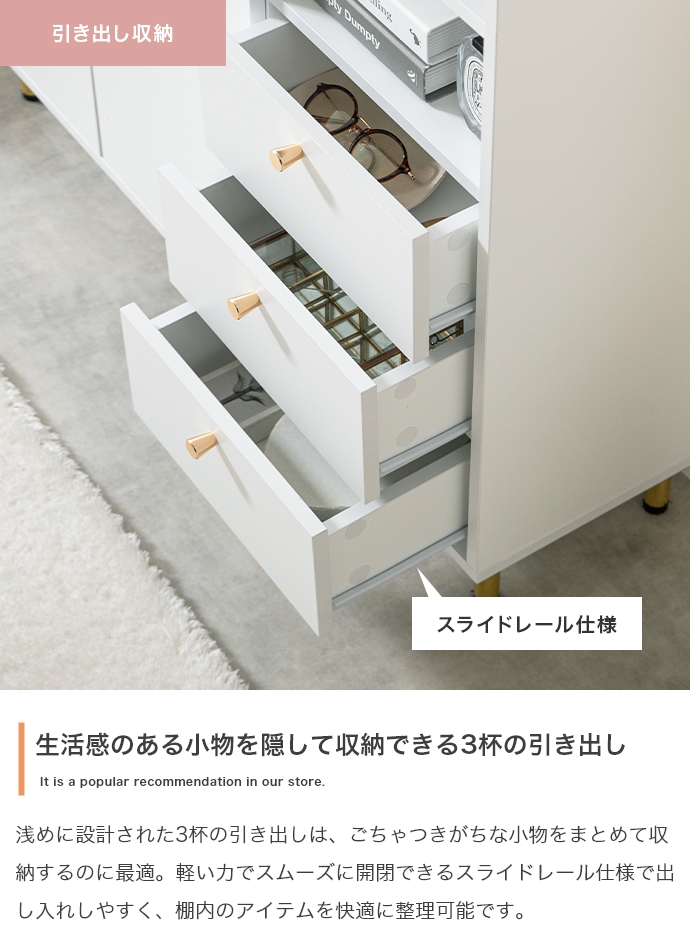備考 | 【梱包サイズ1】106cm×39.5cm×16cm 【梱包サイズ2】78cm×37cm×16cm 【梱包重量1】約22.5kg 【梱包重量2】約14kg 【商品重量】約35.6kg 【耐荷重】天板:約10kg、可動棚:(各)約6kg、オープン収納底板:約5kg、扉収納底板:約8kg、引き出し底板:(各)約5kg ※組み立て時間:2人以上で約90分 ※プラスドライバーをご用意ください。 |