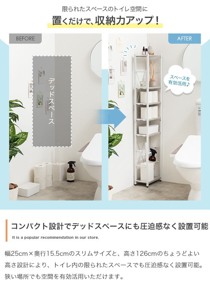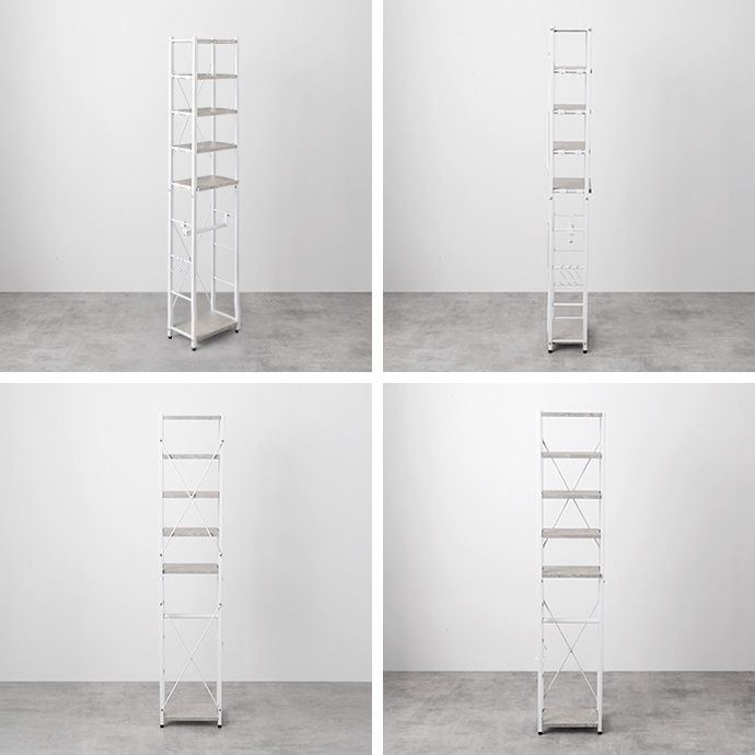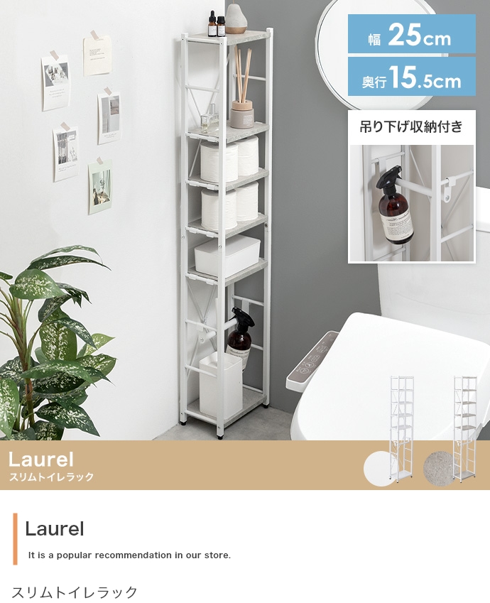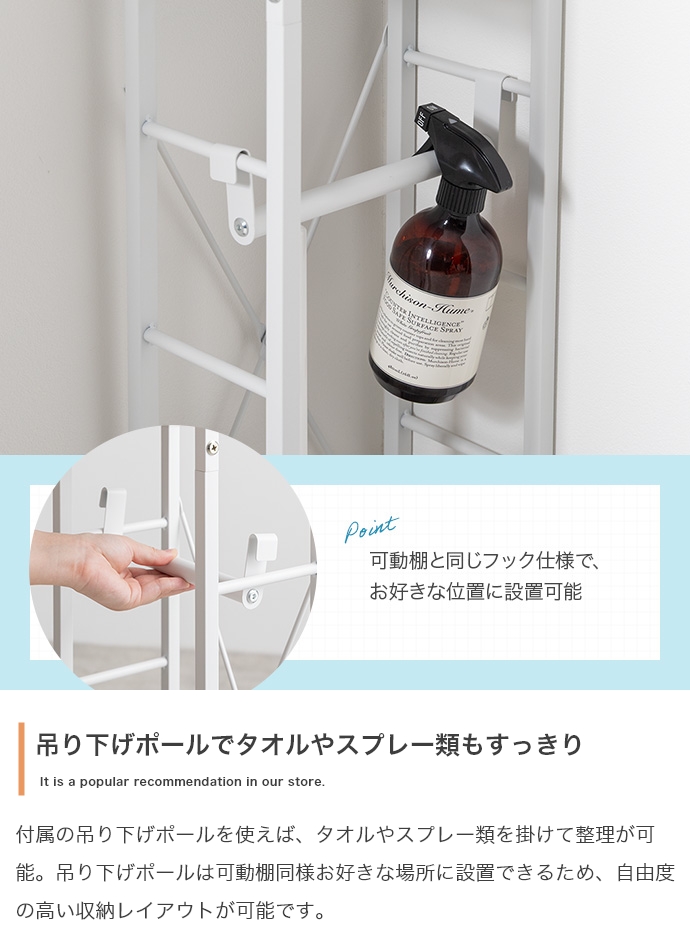 トイレ用品がひとつにまとまるスリムトイレラック。ハイタイプ&可動棚4段と吊り下げポールで、かさばるアイテムもまとめて収納。オープンタイプで圧迫感も少なく、収納物の出し入れも楽々。デッドスペースを有効活用しながら、スッキリ快適な空間を叶えます。