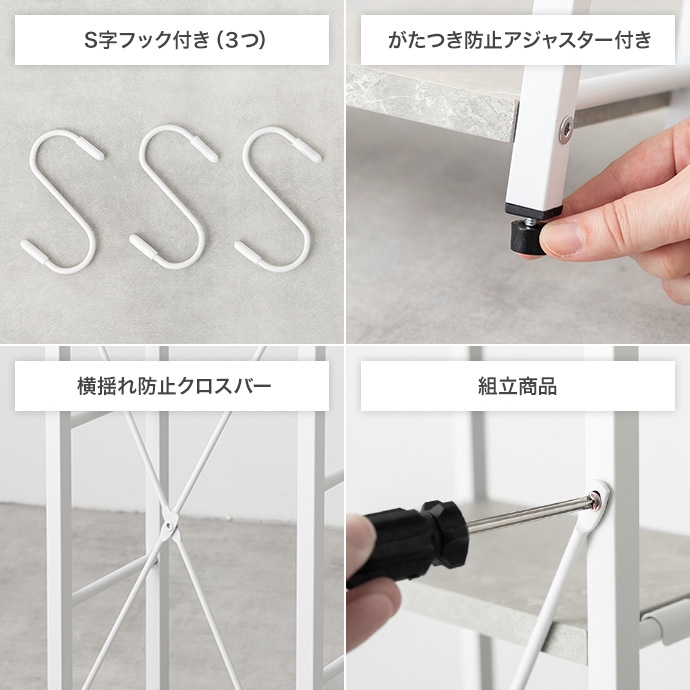 | 備考 | 【梱包サイズ】75.5cm×23cm×14.5cm 【梱包重量】約5.5kg 【商品重量】約4.6kg 【耐荷重】天板:約5kg 、可動棚:各約2kg、サイドフレーム:約0.3kg、吊り下げポール:約2kg ※組み立て時間:2人以上で約30分 ※プラスドライバーをご用意ください。 |
