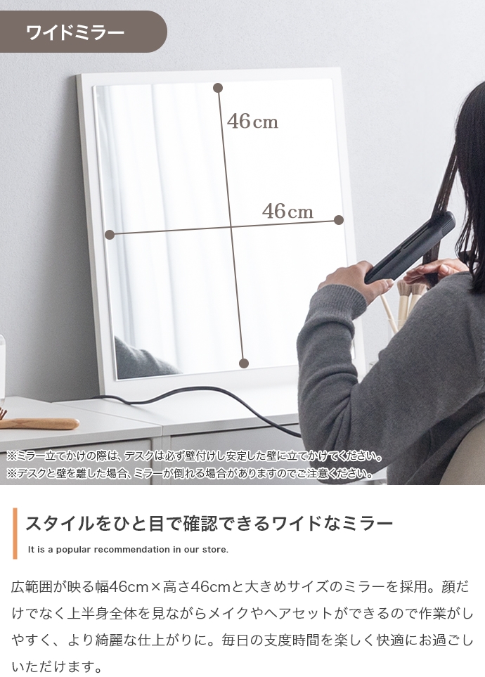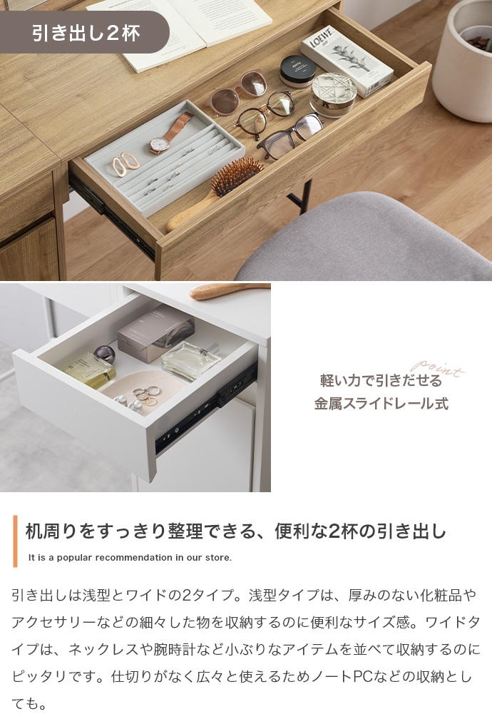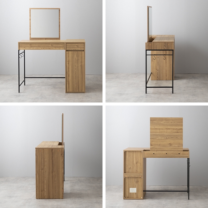 広々と使える天板とワイドミラー、たっぷり収納が魅力のドレッサー+チェアセット。幅100cmの天板とワイドミラーで、毎日のメイク時間を快適に。ミラーは取り外しでき、収納棚は組み立て時に左右の入れ替えも可能。お部屋のレイアウトや利き手に合わせて自由に配置できます。また、ミラー立てかけ利用時にはミラーを裏向けることでデスクとしてお使いいただくことも。