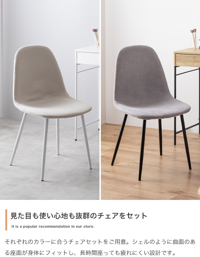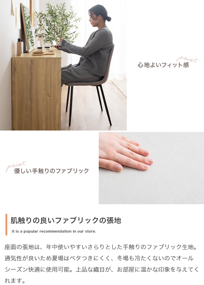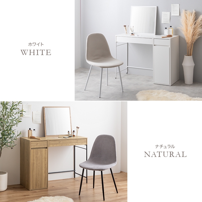 | 素材 | 【ドレッサー】パーティクルボード(メラミン貼り)、鏡 【チェア】布材:ファブリック 中材:ウレタンフォーム 【ドレッサー】スチール(粉体塗装) 【チェア】アイアン(粉体塗装) |