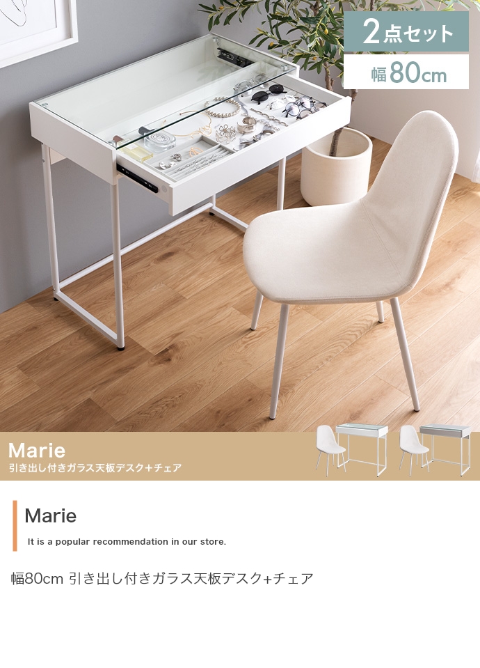 【2点セット】幅80cm 引き出し付きガラス天板デスク+チェア