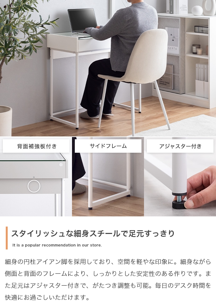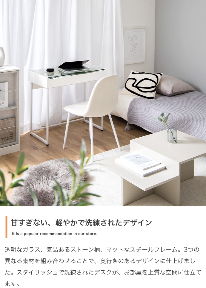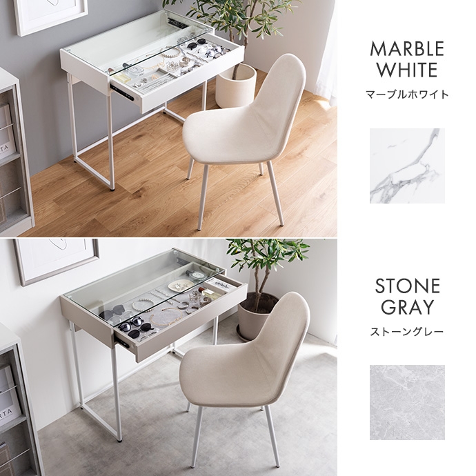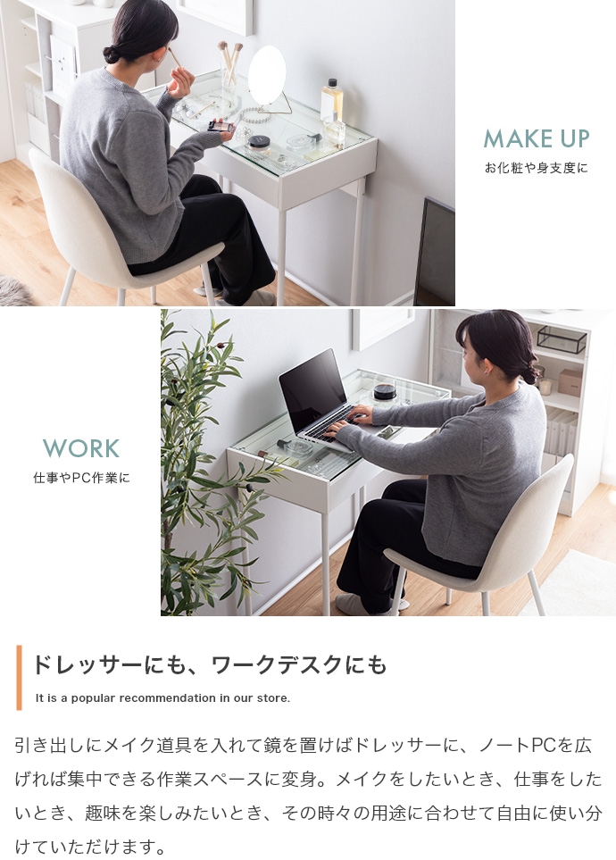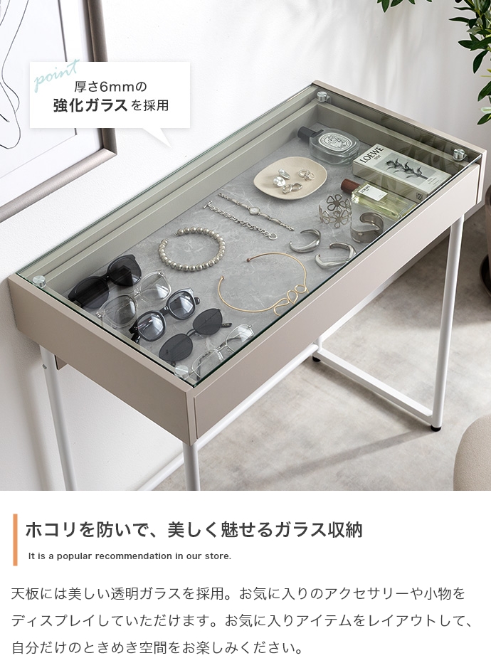 ガラス天板の下に引き出しを配置することで、お気に入りのコスメやアクセサリーがディスプレイできる、まるでショーケースのような美しいガラスデスク。いつも使うものを美しく飾りながら収納でき、デスク自体がお部屋のアクセントに。毎日の身支度やデスクワークが、お気に入りに囲まれた特別な時間に変わります。