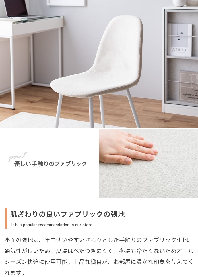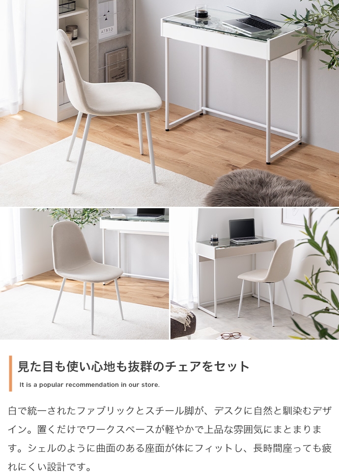 | 素材 | 【デスク】MDF(メラミン貼り)、強化ガラス 【チェア】布材:ファブリック、中材:ウレタンフォーム 【デスク】スチール(粉体塗装) 【チェア】アイアン(粉体塗装) |