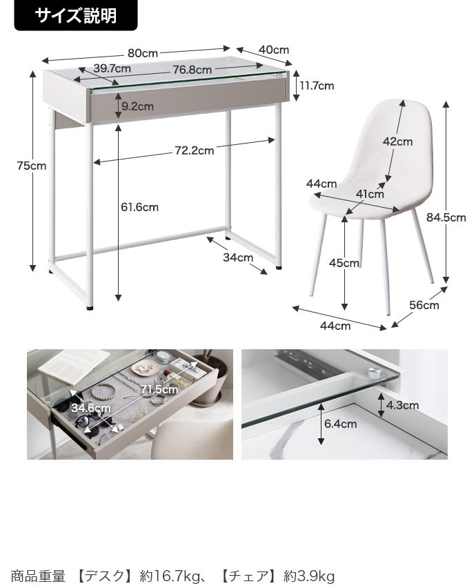 | サイズ | 【デスク】幅80cm×奥行40cm×高さ75cm 【チェア】幅44cm×奥行56cm×高さ84.5cm(座面高:45cm) |