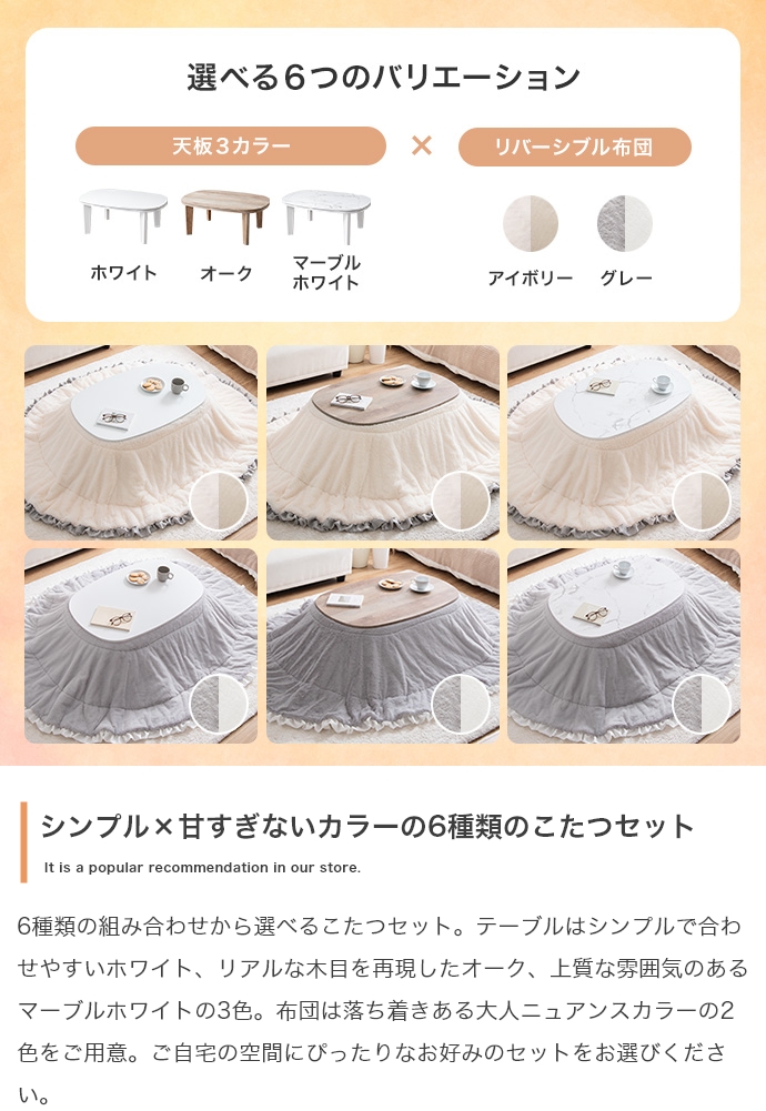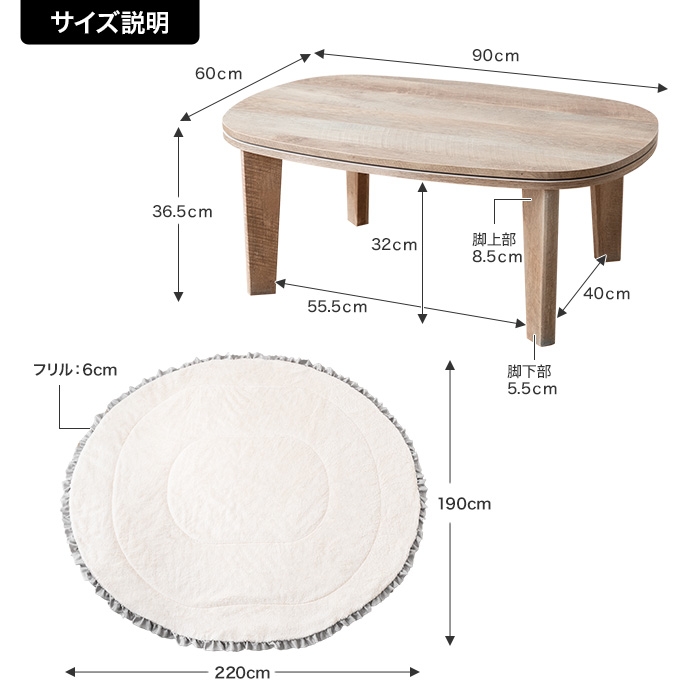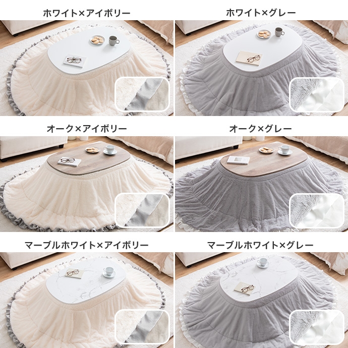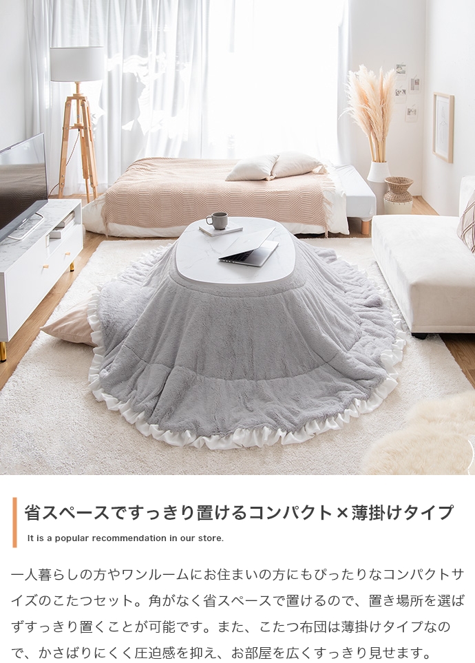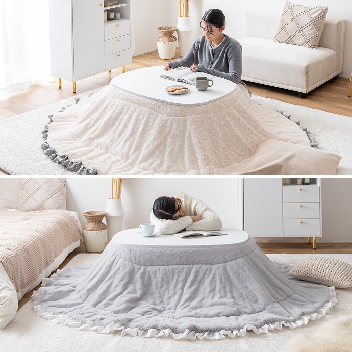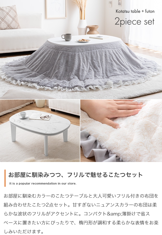 お部屋に馴染むカラーのこたつテーブルと大人可愛いフリル付きの布団を組み合わせたこたつ2点セット。甘すぎないニュアンスカラーの布団は柔らかな波状のフリルがアクセントに。コンパクト&薄掛けで省スペースに置きたい方にぴったりで、楕円形が調和する柔らかな表情をお楽しみいただけます。