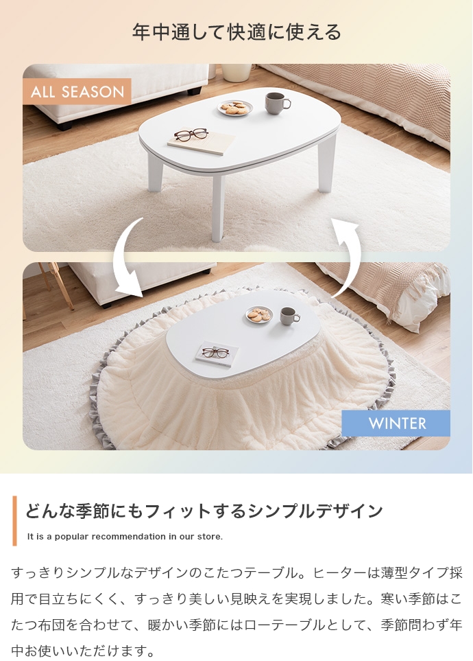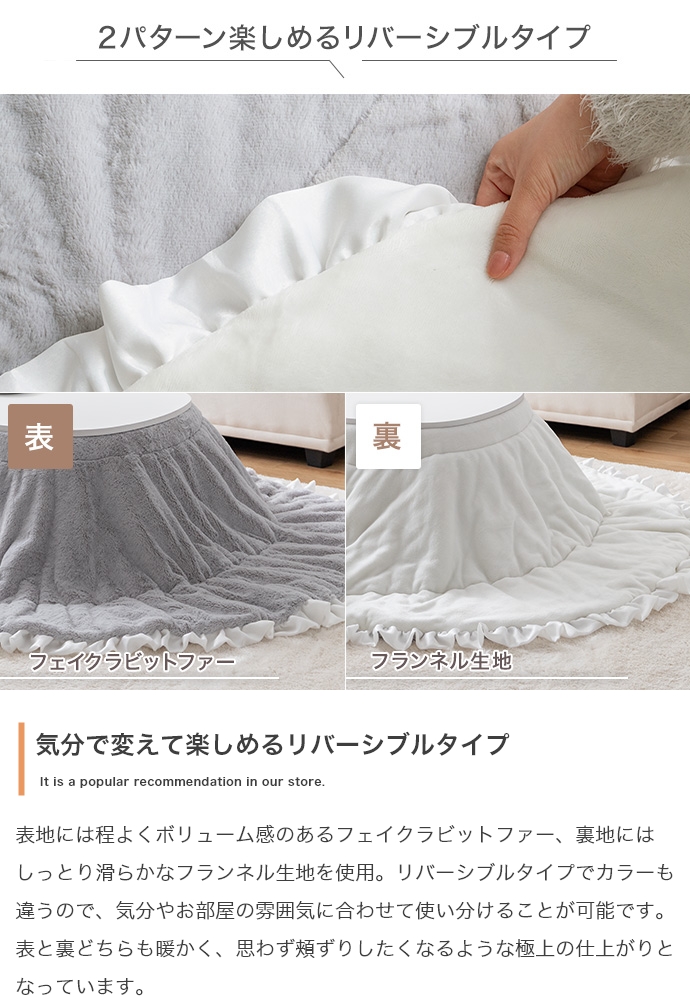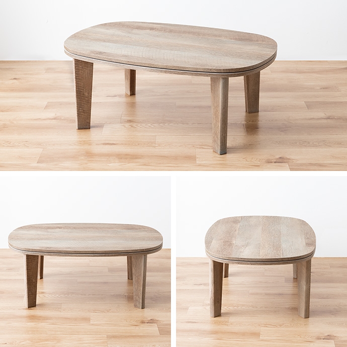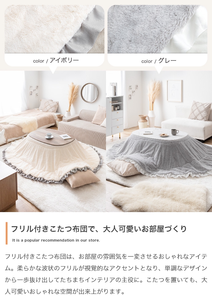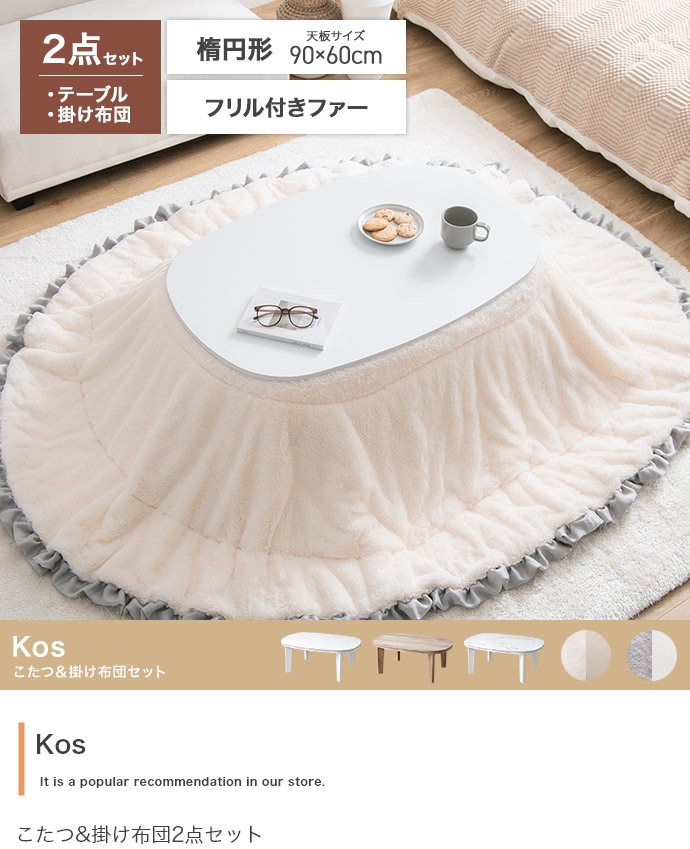 お部屋に馴染むカラーのこたつテーブルと大人可愛いフリル付きの布団を組み合わせたこたつ2点セット。甘すぎないニュアンスカラーの布団は柔らかな波状のフリルがアクセントに。コンパクト&薄掛けで省スペースに置きたい方にぴったりで、楕円形が調和する柔らかな表情をお楽しみいただけます。