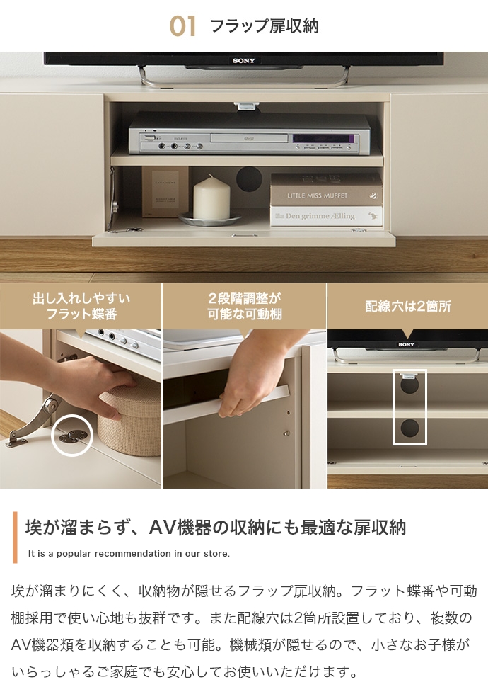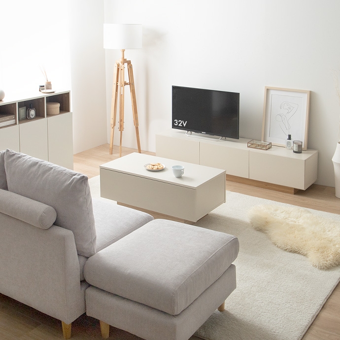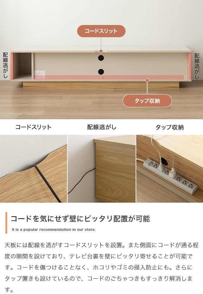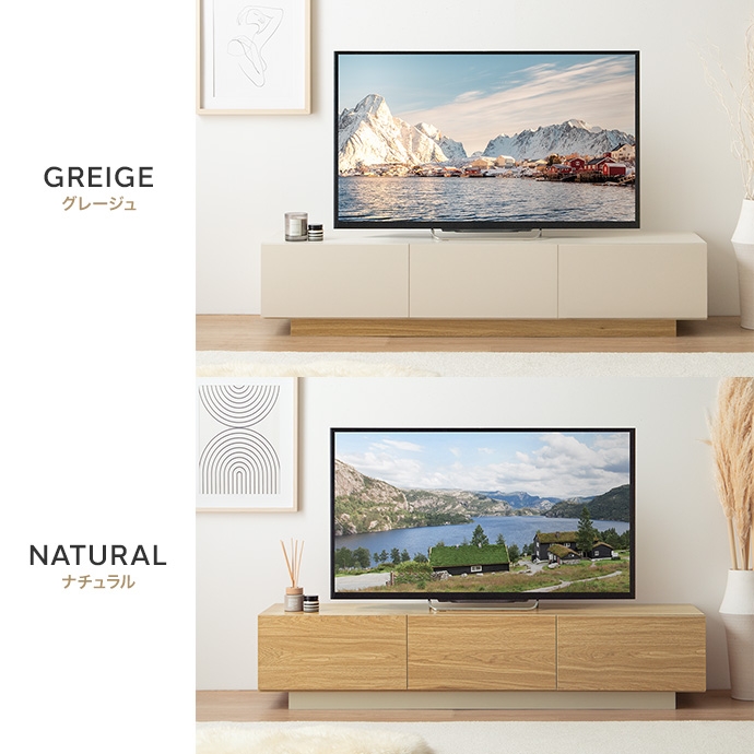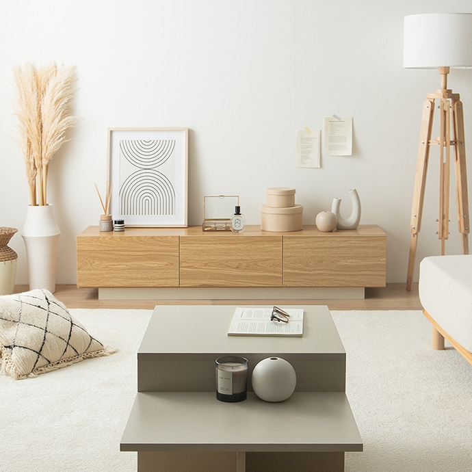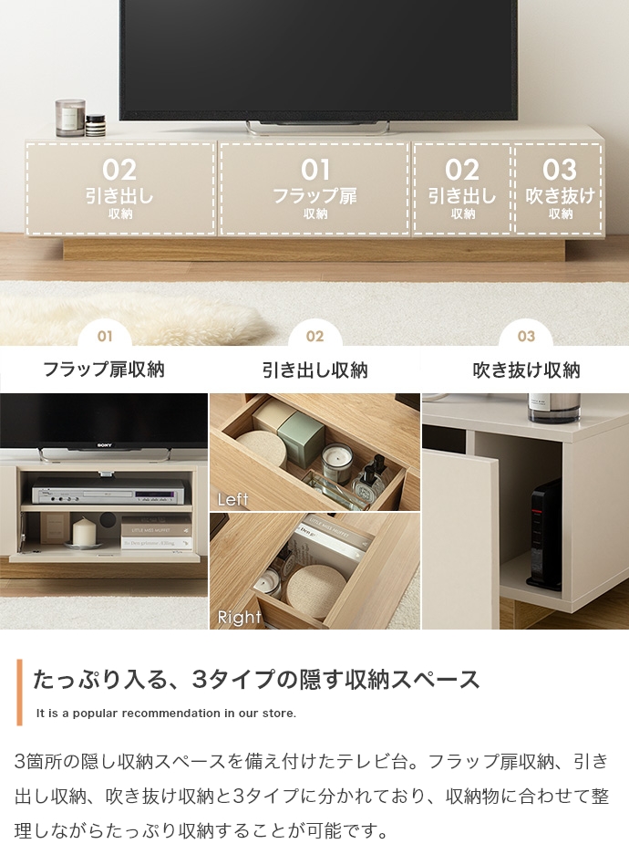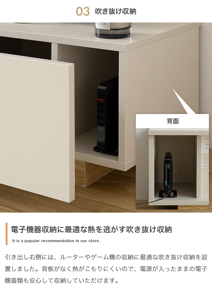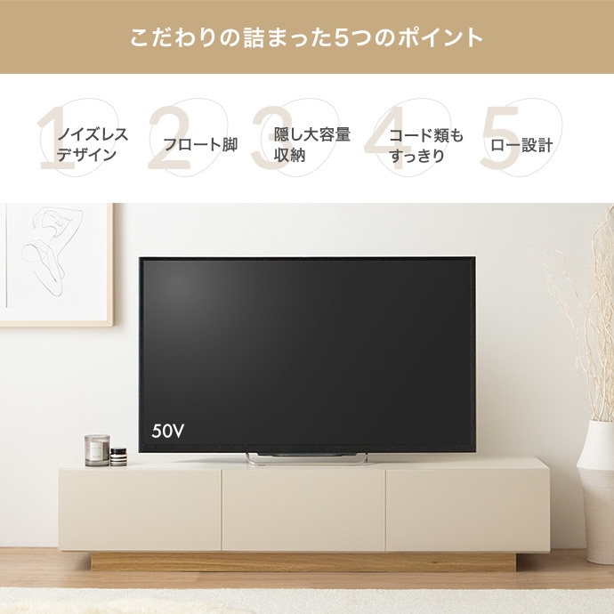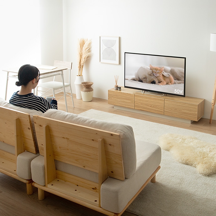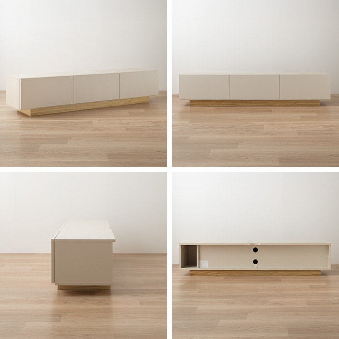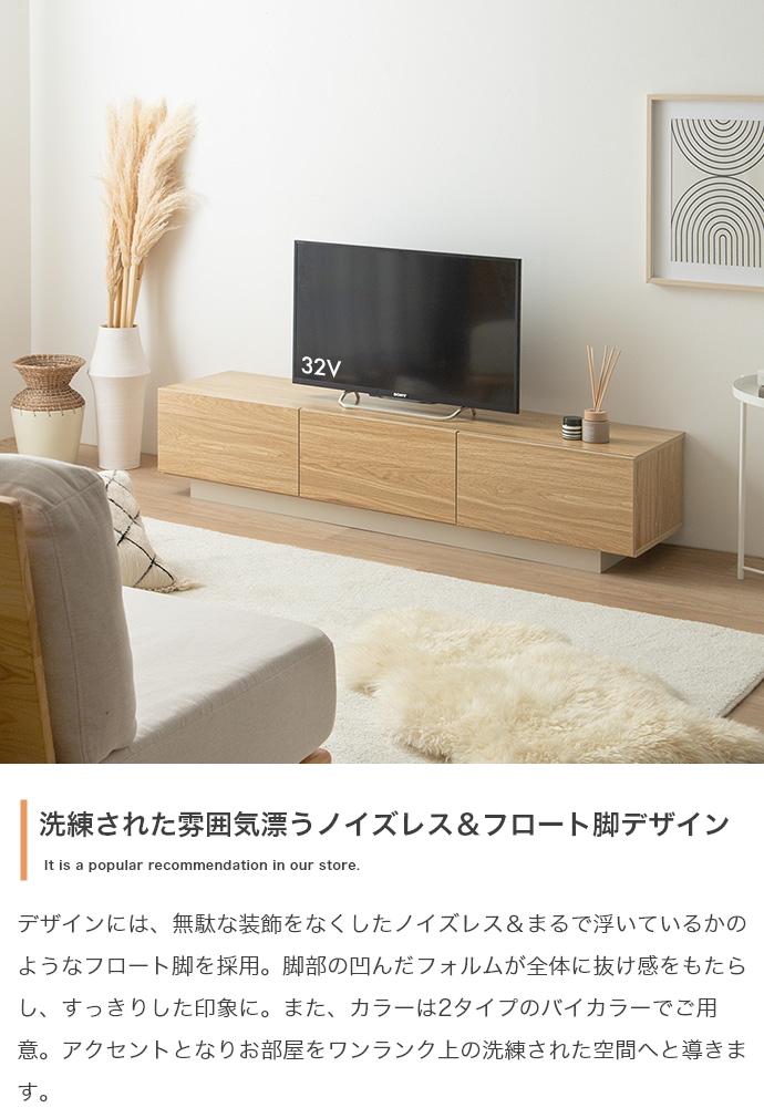バイカラーの配色が特徴的な引き出し付きテレビ台。ノイズレスでフロート脚のデザインは、置くだけでアクセントとなり、洗練された空間へと導きます。また引き出し収納や扉収納、吹き抜け収納を設置し、大容量収納ができるのでテレビ周りもすっきり。さらに壁付けで配置できるのに配線もすっきり通すことのできる設計に仕上げました。シンプルなのにこだわりの詰まったデザインと実用性を兼ねそろえたテレビ台です。