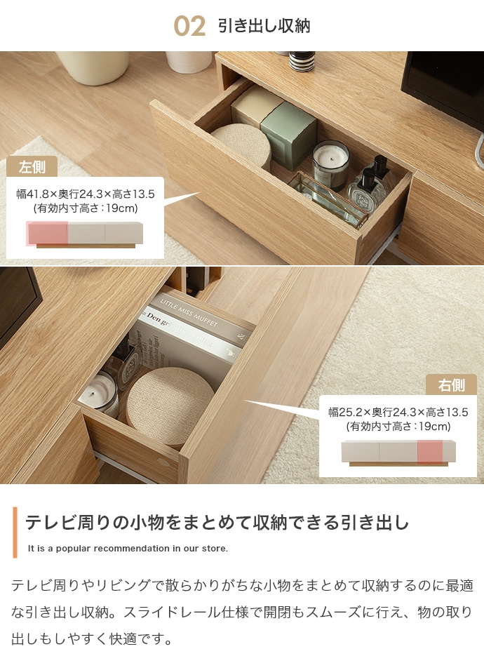 | 備考 | 【梱包サイズ】156cm×42.6cm×14.5cm 【梱包重量】約29kg 【商品重量】約26.6kg 【耐荷重】天板:約25kg、可動棚:約5kg、扉収納底板:約10kg、吹き抜け収納底板:約5kg、左側引き出し:約5kg、右側引き出し:約3kg ※組み立て時間:2人以上で約90分 ※プラスドライバーをご用意ください。 |