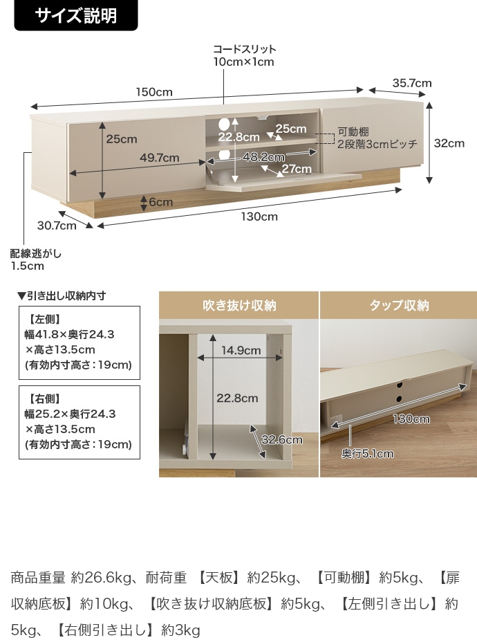 | サイズ | 幅150cm×奥行35.7cm×高さ32cm |