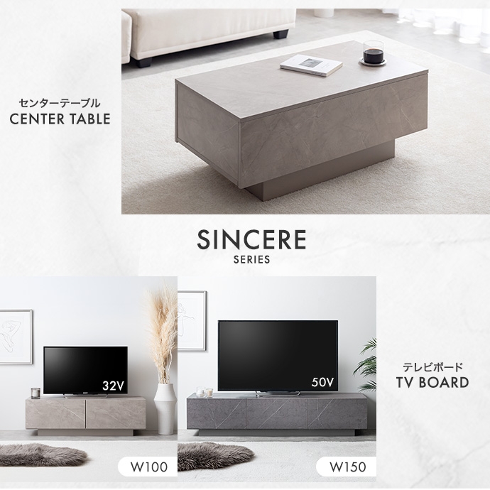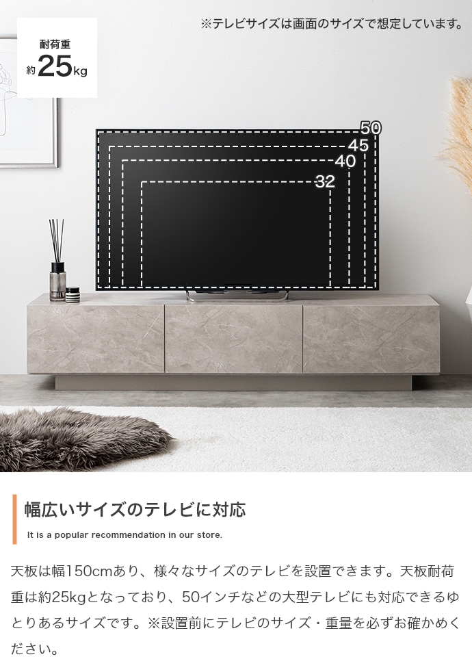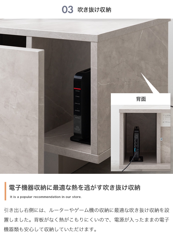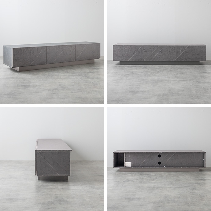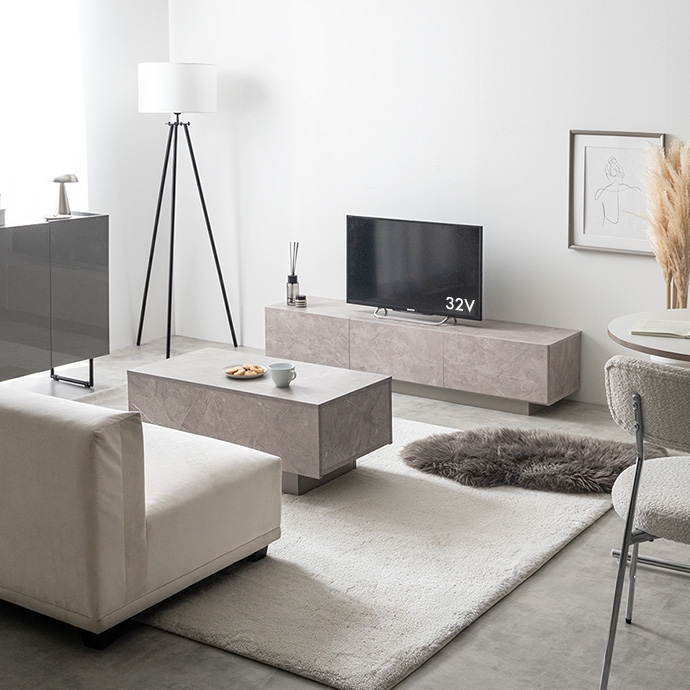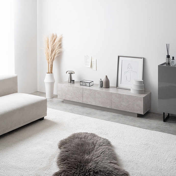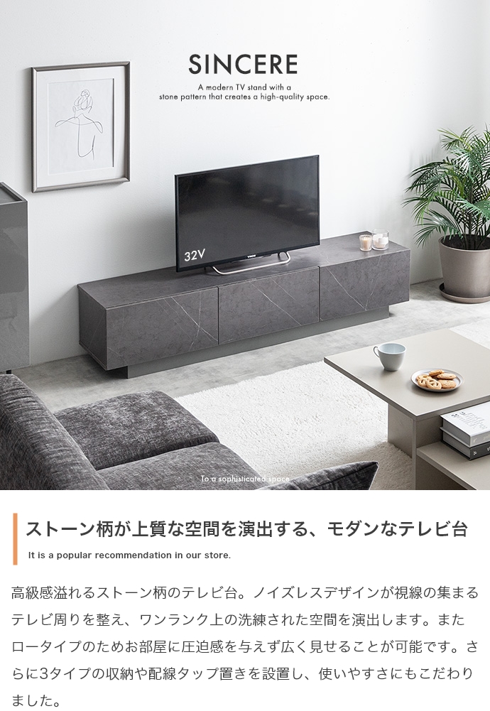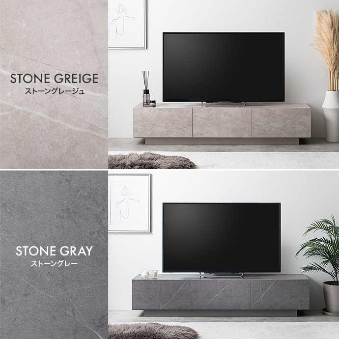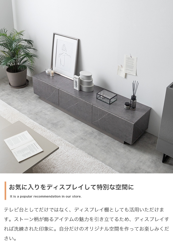 ストーン柄のニュアンスが上質な空間を作る引き出し付きテレビ台。無駄を省いたノイズレスなフォルムと、ストーン柄の組み合わせが美しいデザイン。お部屋に置くだけでアクセントとなり、洗練された空間へと導きます。また3種類の収納スペースにより、デジタル機器や小物を収納可能。視線の集まるテレビ周りをすっきり整えられるテレビ台です。