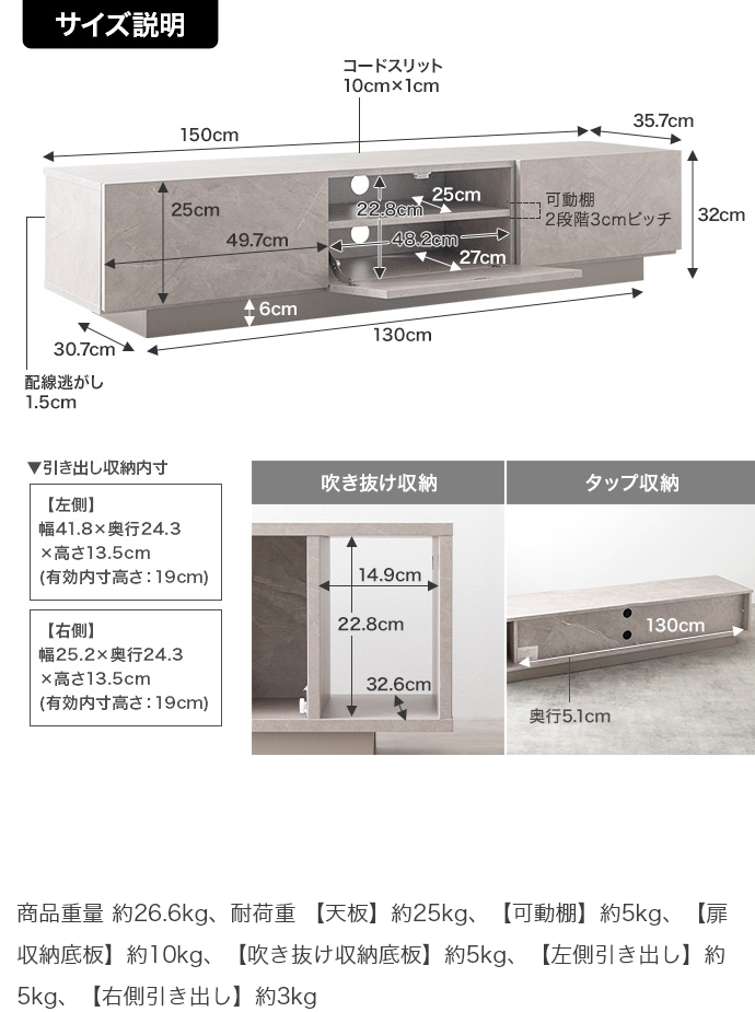 | サイズ | 幅150cm×奥行35.7cm×高さ32cm |