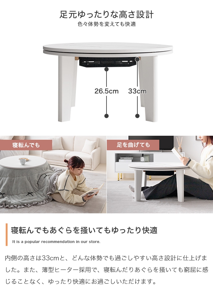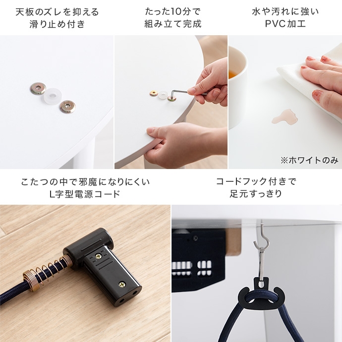 | 素材 | 【テーブル】 ホワイト:天板:パーティクルボード(PVC貼り)、中天板:パーティクルボード(紙貼り) マーブルホワイト:天板・中天板:パーティクルボード(紙貼り) ヒーター:MS-303H(B) 300W石英管ヒーター(中間スイッチ) 【布団】 側生地:ポリエステル100%(表地:フランネル/裏地:フェイクラビットファー) 中材:ポリエステル100% 【テーブル】MDF(PVC貼り) |