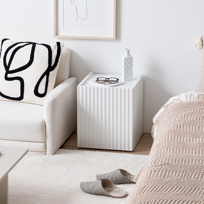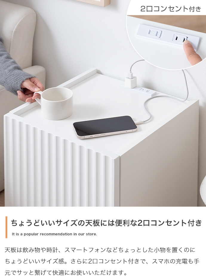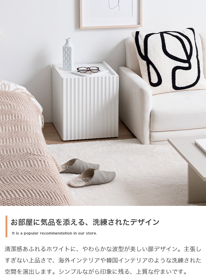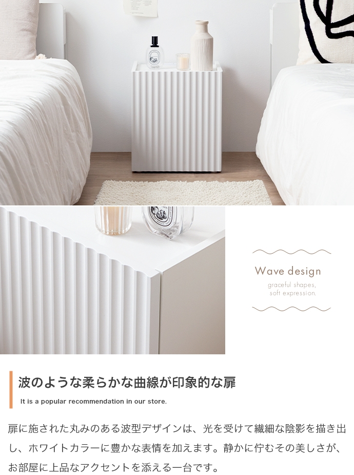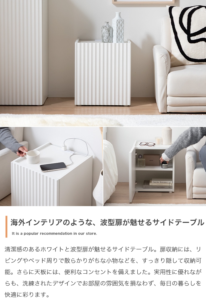 清潔感のあるホワイトと波型扉が魅せるサイドテーブル。お部屋に気品を添える美しいデザインは、主張しすぎない上品さで、海外インテリアや韓国インテリアのような洗練された空間を演出します。扉収納には、リビングやベッド周りで散らかりがちな小物などを、すっきり隠して収納可能。さらに天板には、便利なコンセントを備えました。実用性に優れながらも、洗練されたデザインでお部屋の雰囲気を損なわず、毎日の暮らしを快適に彩ります。