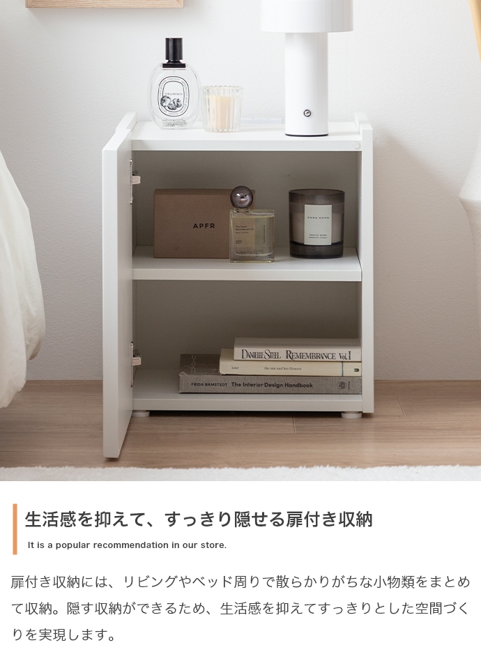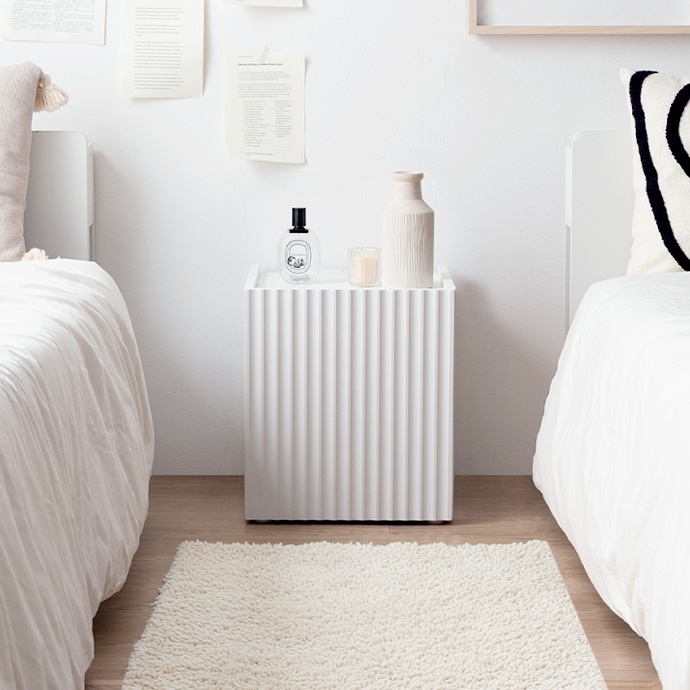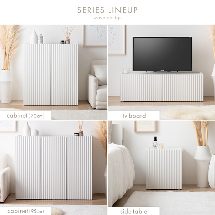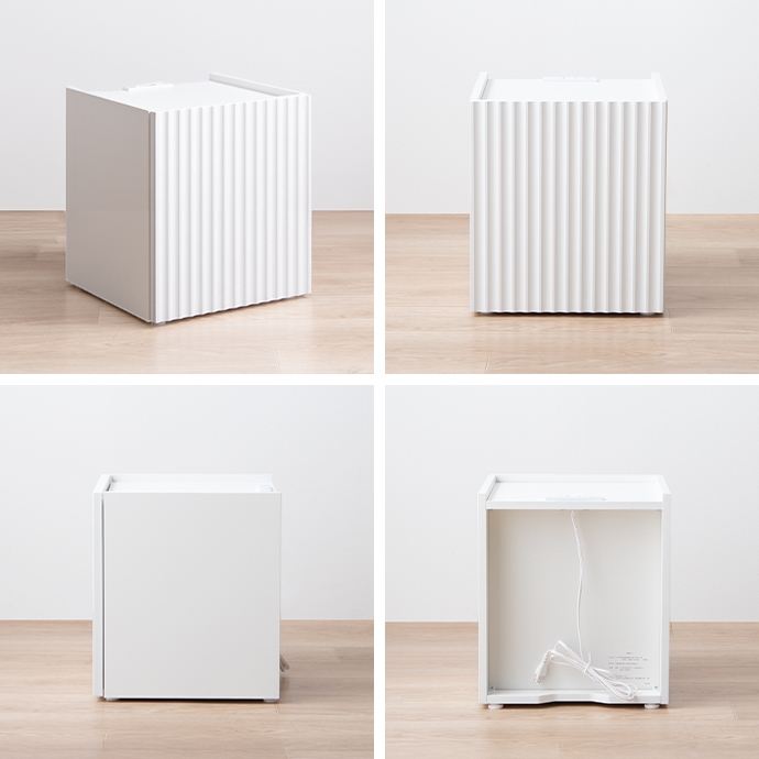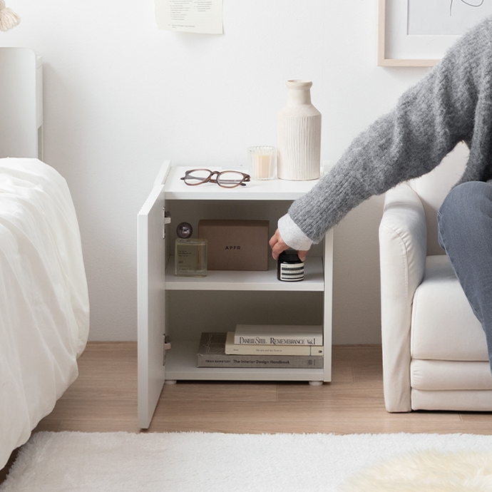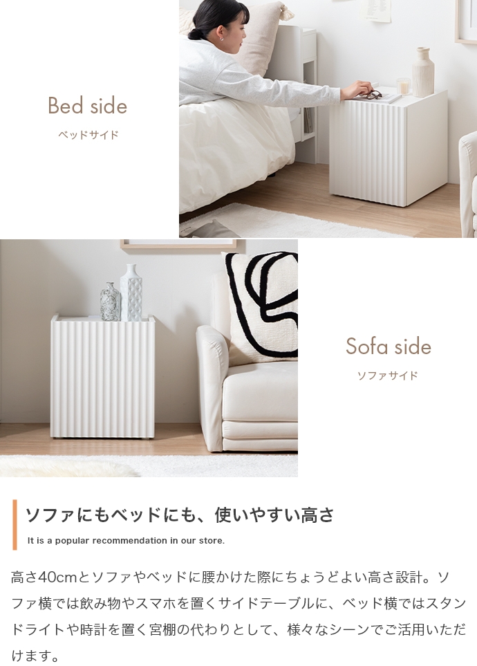 清潔感のあるホワイトと波型扉が魅せるサイドテーブル。お部屋に気品を添える美しいデザインは、主張しすぎない上品さで、海外インテリアや韓国インテリアのような洗練された空間を演出します。扉収納には、リビングやベッド周りで散らかりがちな小物などを、すっきり隠して収納可能。さらに天板には、便利なコンセントを備えました。実用性に優れながらも、洗練されたデザインでお部屋の雰囲気を損なわず、毎日の暮らしを快適に彩ります。
