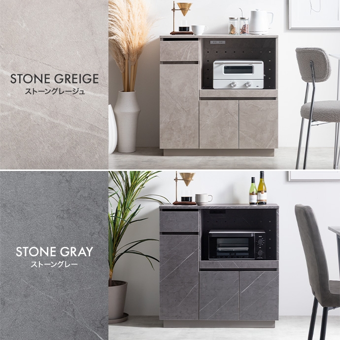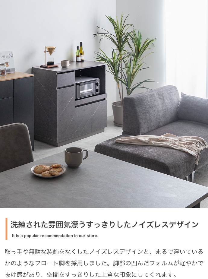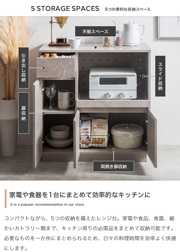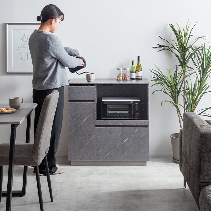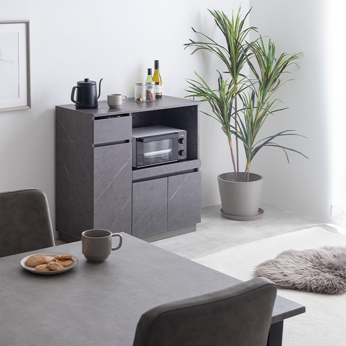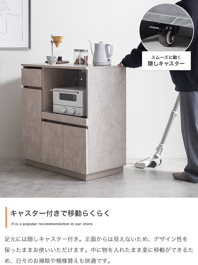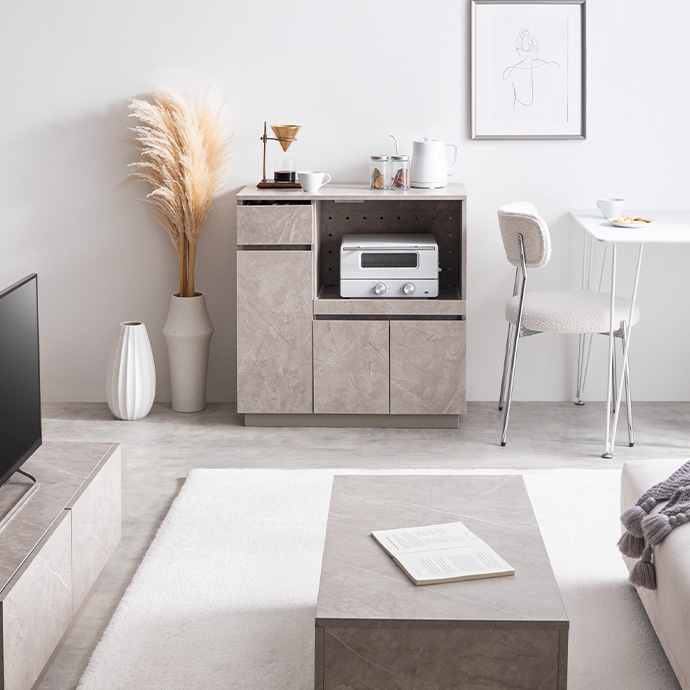 自然な風合いを感じるストーン柄が印象的な、洗練されたデザインのレンジ台。高級感のある佇まいが、キッチンをワンランク上の空間へと導きます。シンプルな見た目ながら収納力はしっかり備えており、家電や食器・小物などのキッチン用品をまとめて収納が可能。さらに足元には隠しキャスター付きで、掃除や模様替えも簡単に行える、使い勝手抜群のレンジ台です。