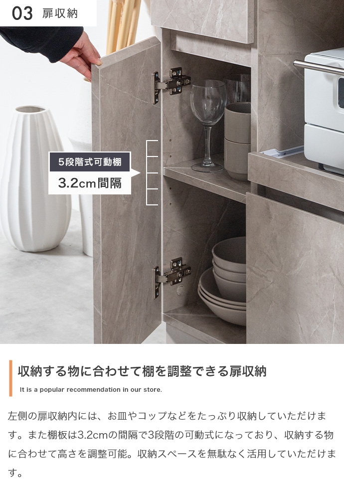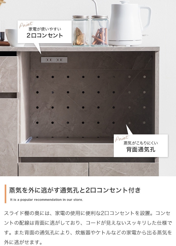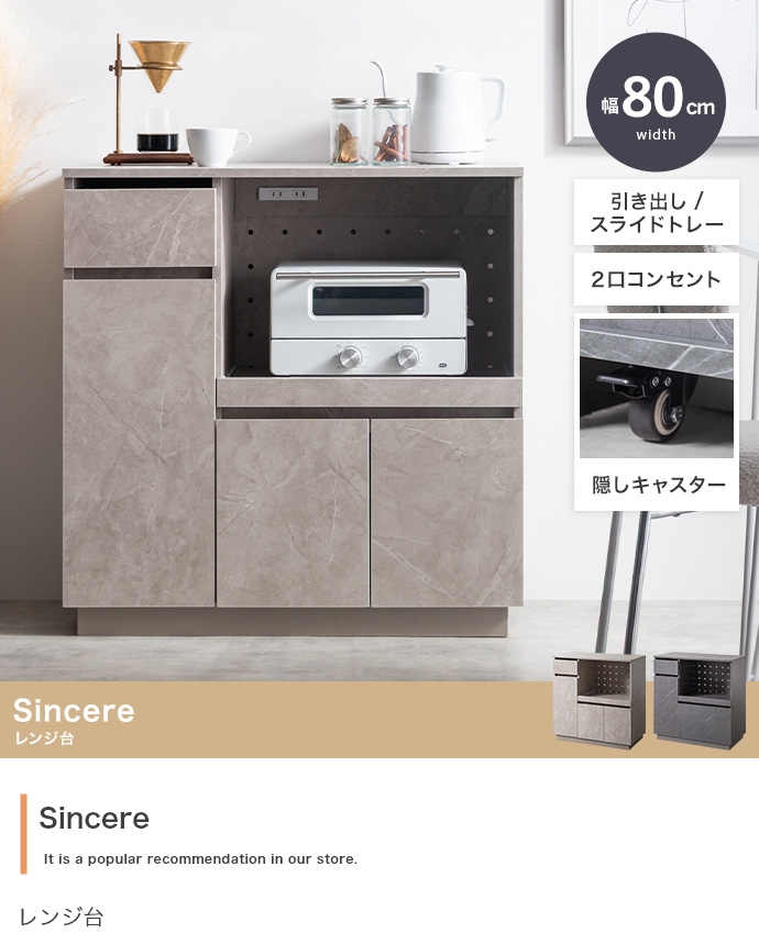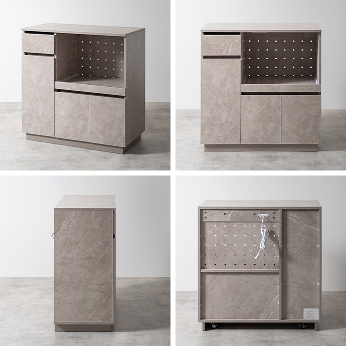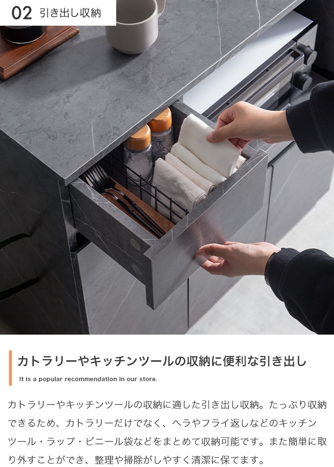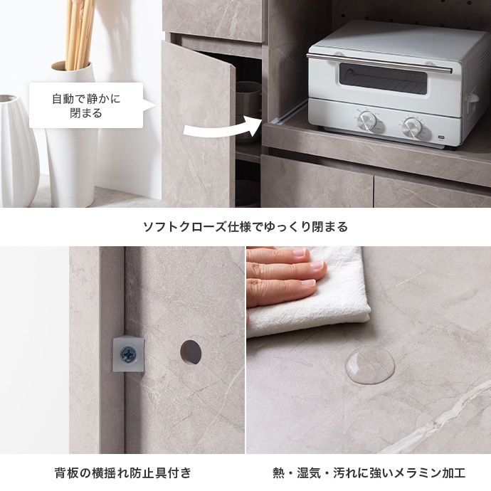 自然な風合いを感じるストーン柄が印象的な、洗練されたデザインのレンジ台。高級感のある佇まいが、キッチンをワンランク上の空間へと導きます。シンプルな見た目ながら収納力はしっかり備えており、家電や食器・小物などのキッチン用品をまとめて収納が可能。さらに足元には隠しキャスター付きで、掃除や模様替えも簡単に行える、使い勝手抜群のレンジ台です。