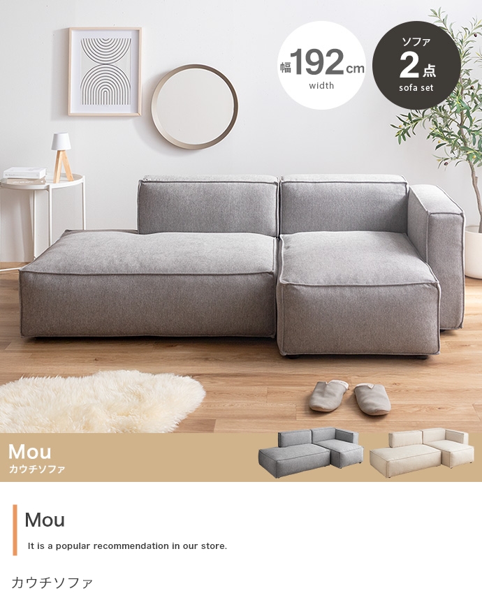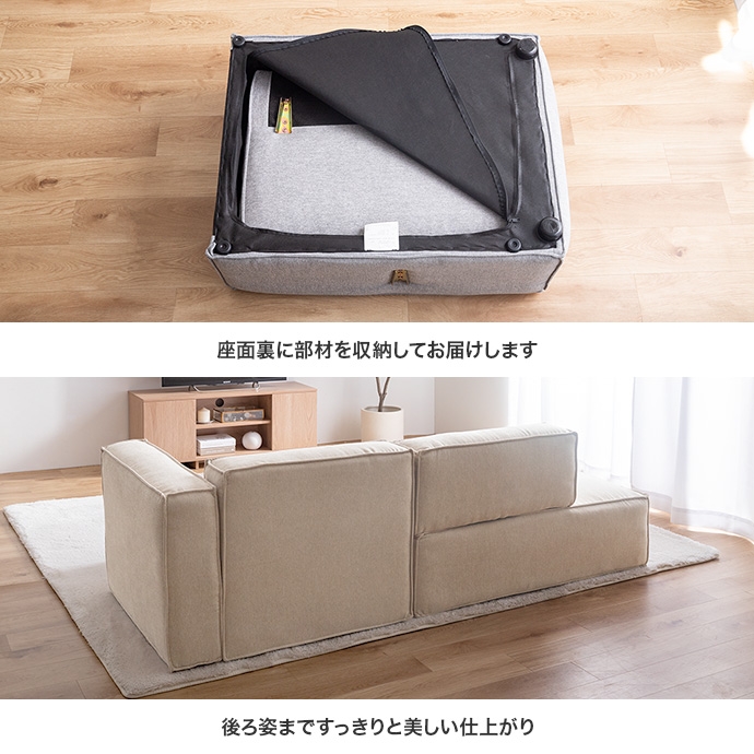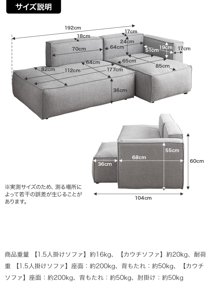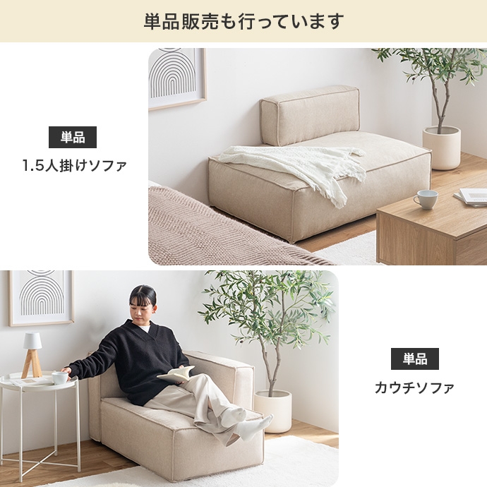 | 備考 | 【梱包サイズ1】113cm×83cm×33cm 【梱包サイズ2】66cm×88cm×50cm 【梱包重量1】約19kg 【梱包重量2】約23kg 【商品重量】1.5人掛けソファ:約16kg、カウチソファ:約20kg 【耐荷重】座面:(各)約200kg、背もたれ:(各)約50kg、肘掛け:約50kg ※組み立て時間:2人以上で約20分 ※組立工具は不要。 |