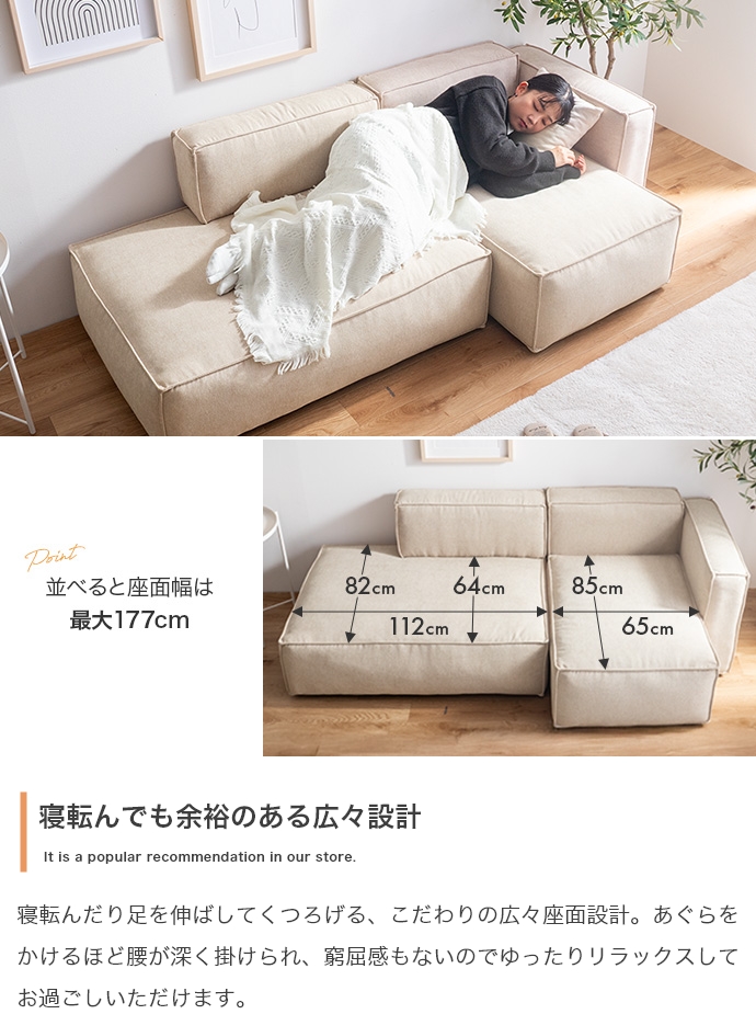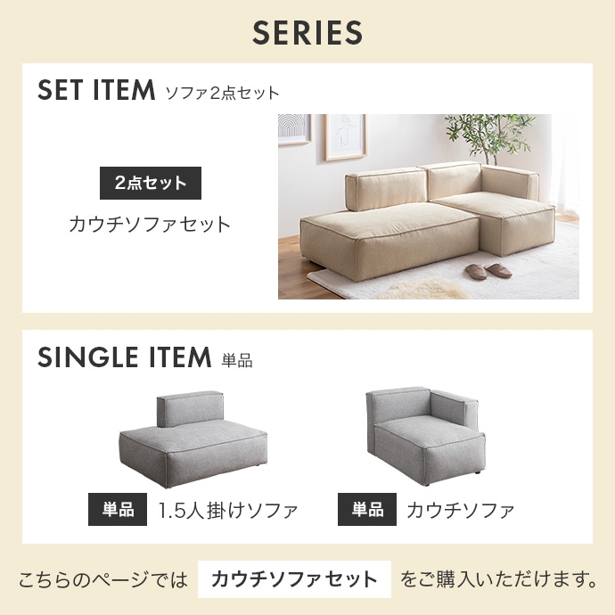 | サイズ | 【1.5人掛けソファ】幅112cm×奥行82cm×高さ60cm(座面高:36cm) 【カウチソファ】幅80cm×奥行104cm×高さ60cm(座面高:36cm) |