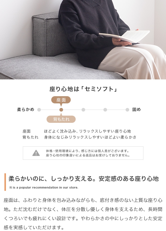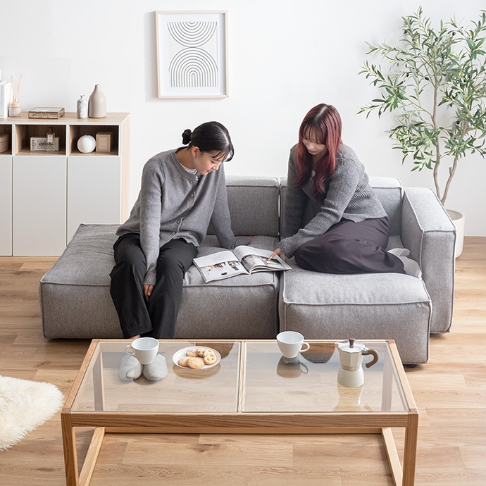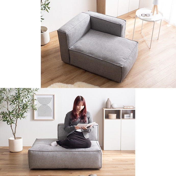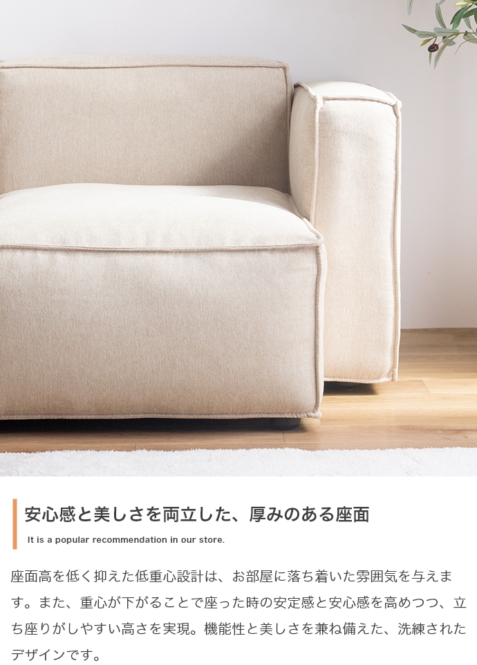足を伸ばしてゆったりくつろげるローソファー。直線的な構造美が目を惹く、存在感抜群のソファです。研ぎ澄まされたシンプルさが、お部屋に静かなアクセントをもたらし、ナチュラルから大人カジュアルまで、幅広いテイストに調和します。さらに、広々座面とふかふかな座り心地で、のびのびとした快適さを実現。また、座面高を低く抑えた低重心設計で、お部屋を落ち着いた大人の空間に導きます。セットでのご利用はもちろん、単品での使い方もお楽しみいただけます。