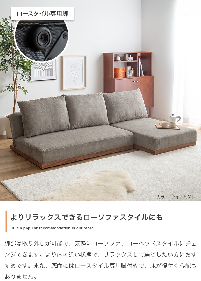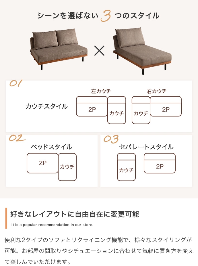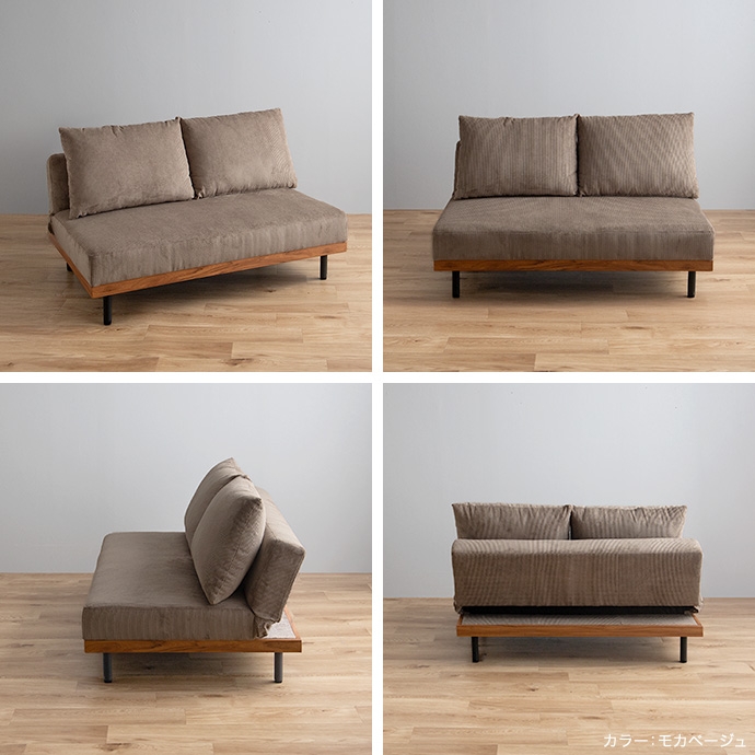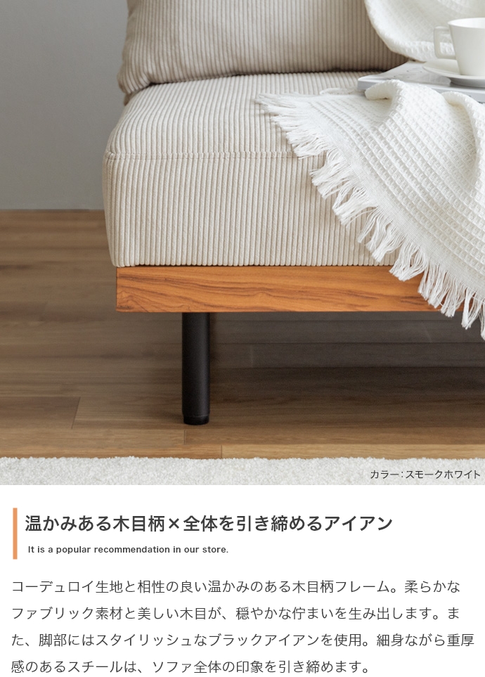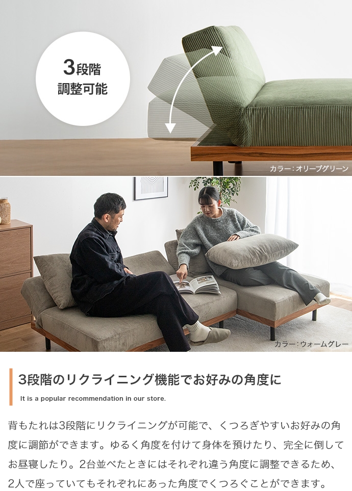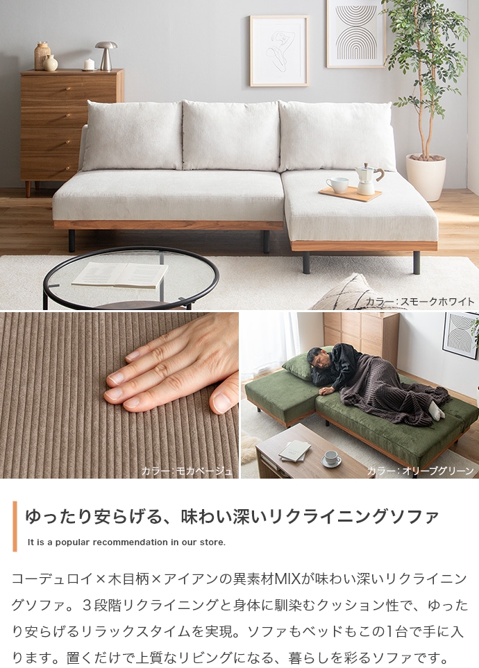 コーデュロイ×木目柄×アイアンの異素材MIXが味わい深いリクライニングソファ。コーデュロイの優しい肌触りと心地よい弾力のクッション、楽な姿勢に調整できる3段階リクライニングで、快適なくつろぎタイムを叶えます。あぐらもかける広々座面ながら、脚も取り外せるロー設計なので圧迫感が少なく、ワンルームなどのスペースに余裕のないお部屋にもピッタリ。また、2脚揃えるとソファベッドになり、友人や家族が泊まりに来た時用の簡易ベッドや、足をのばしてくつろぐゆったりソファとしても大活躍します。