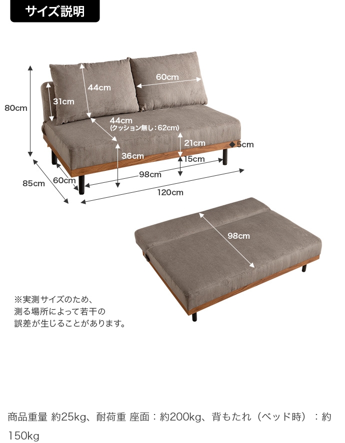 | サイズ | 【ソファ時】幅120cm×奥行85cm×高さ80cm(座面高:36cm) 【ベッド時】幅120cm×奥行98cm×高さ36cm |