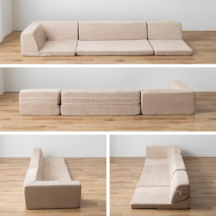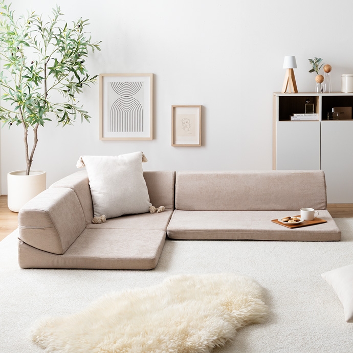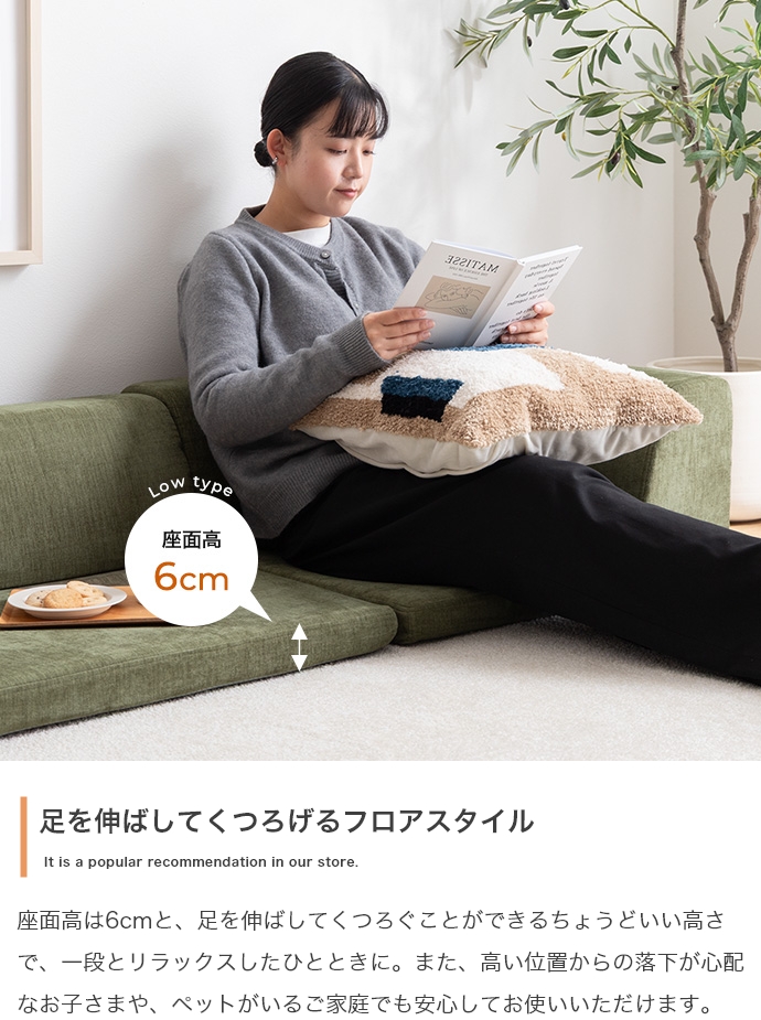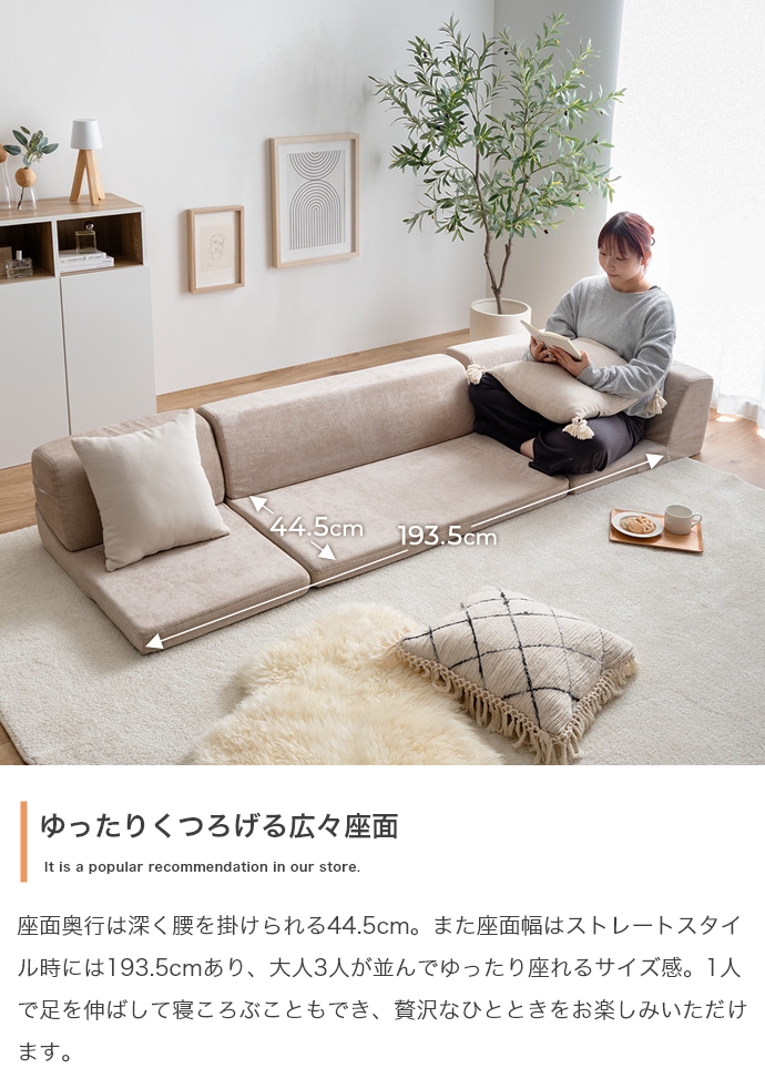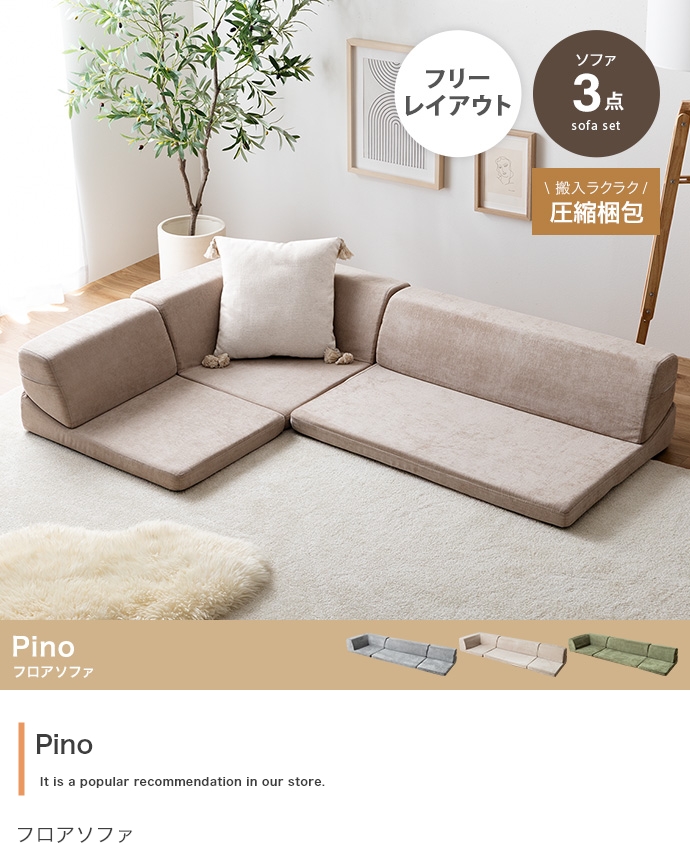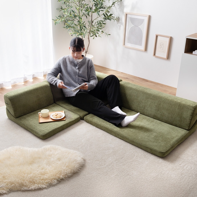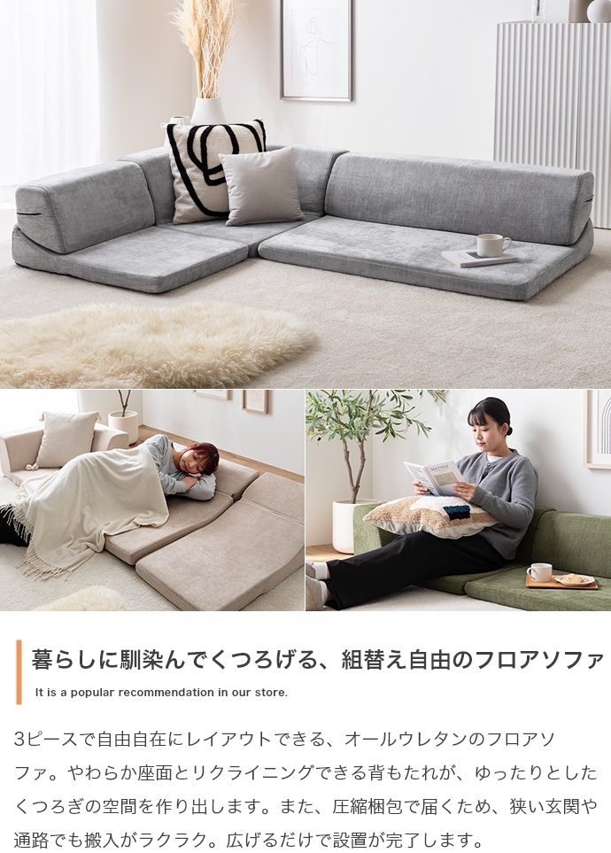 3ピースで自由自在にレイアウトできる、オールウレタンのフロアソファ。やわらか座面とリクライニングできる背もたれが、ゆったりとしたくつろぎの空間を作り出します。また、圧縮梱包で届くため、狭い玄関や通路でも搬入がラクラク。広げるだけで設置が完了します。