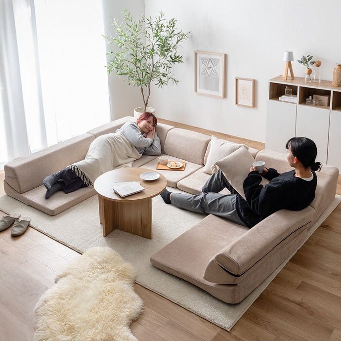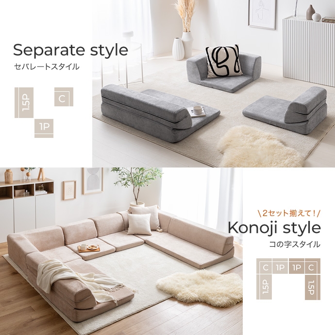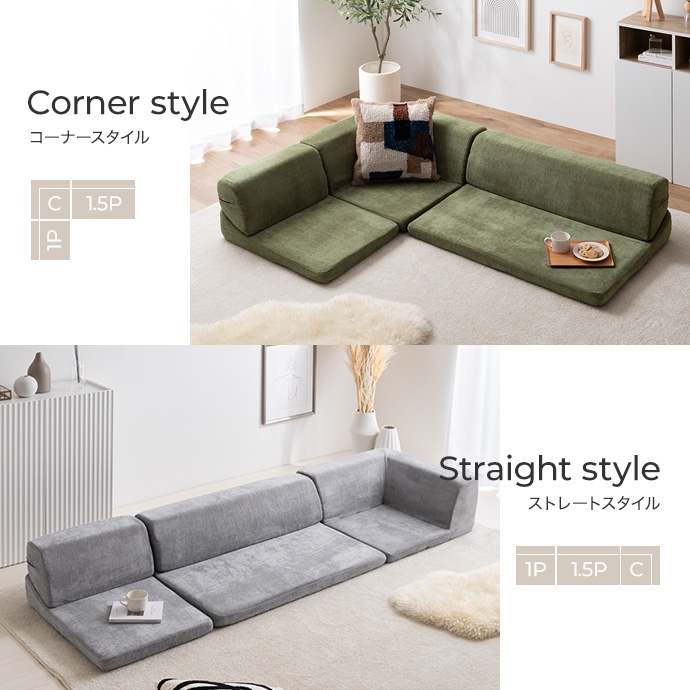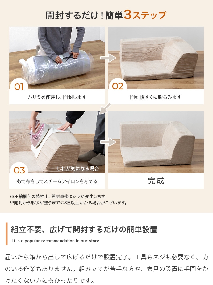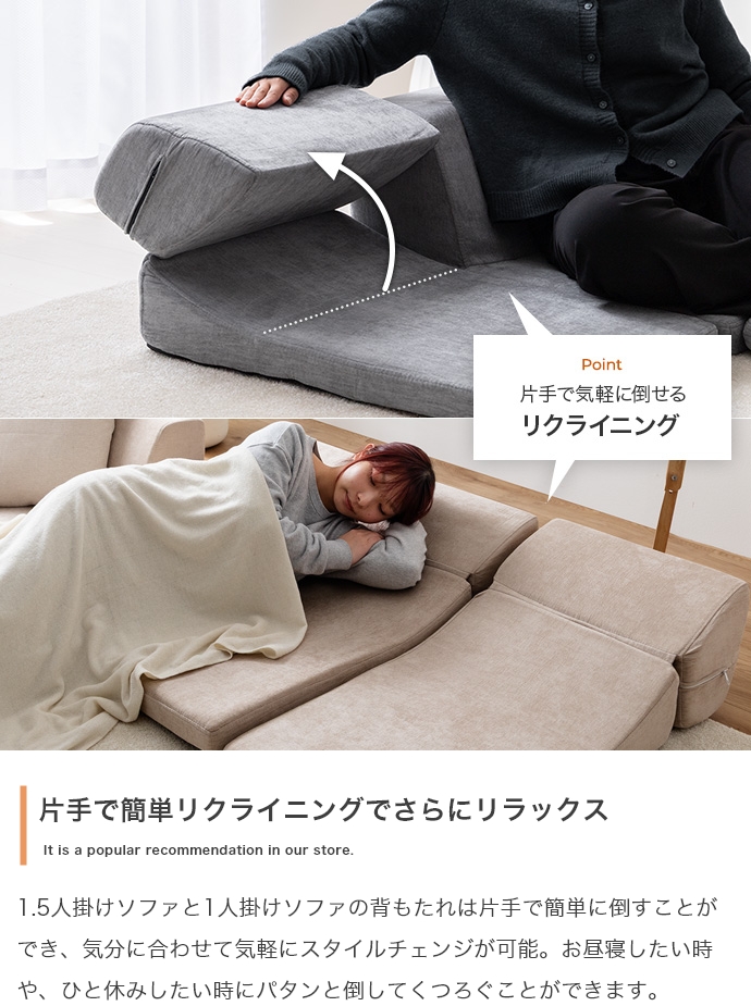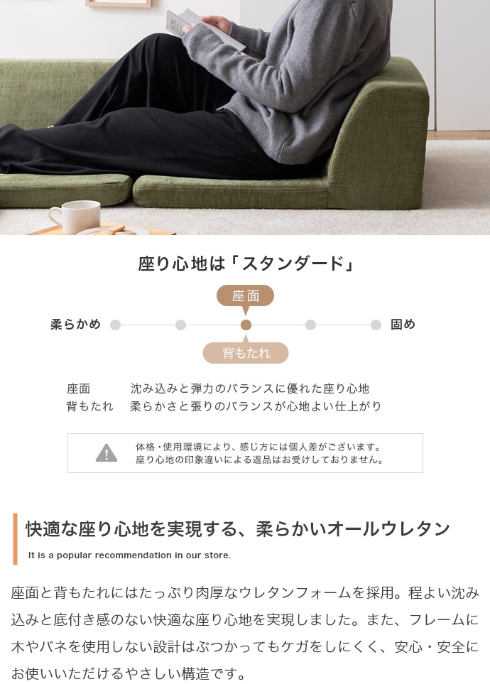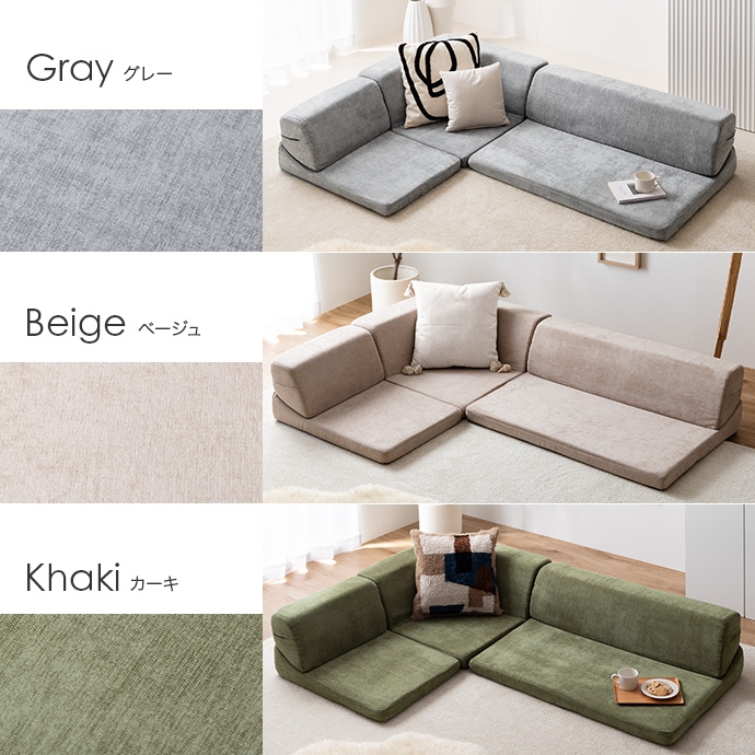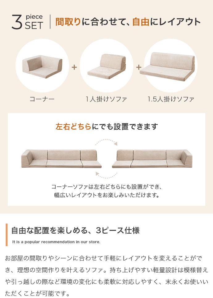 3ピースで自由自在にレイアウトできる、オールウレタンのフロアソファ。やわらか座面とリクライニングできる背もたれが、ゆったりとしたくつろぎの空間を作り出します。また、圧縮梱包で届くため、狭い玄関や通路でも搬入がラクラク。広げるだけで設置が完了します。