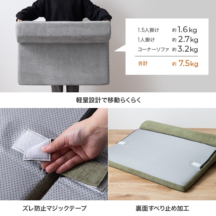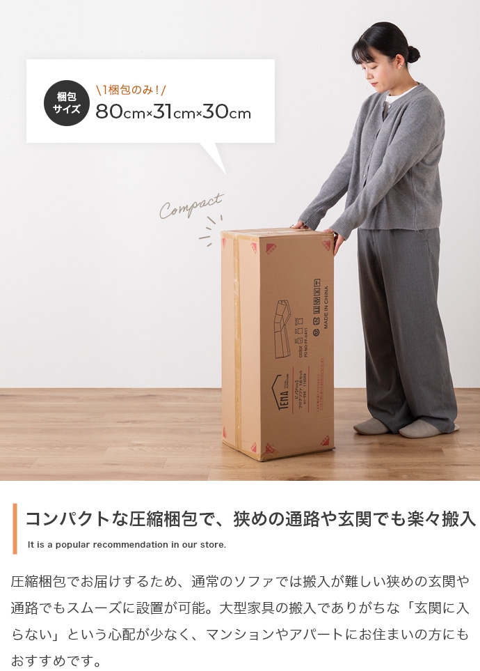 | 備考 | 【梱包サイズ】80cm×31cm×30cm 【梱包重量】約10kg 【商品重量】1.5人掛け:約1.6kg、1人掛け:約2.7kg、コーナー:約3.2kg 【耐荷重】1.5人掛け:約100kg、1人掛け:約100kg、コーナー:約100kg ※開梱時間:2人以上で約5分 |