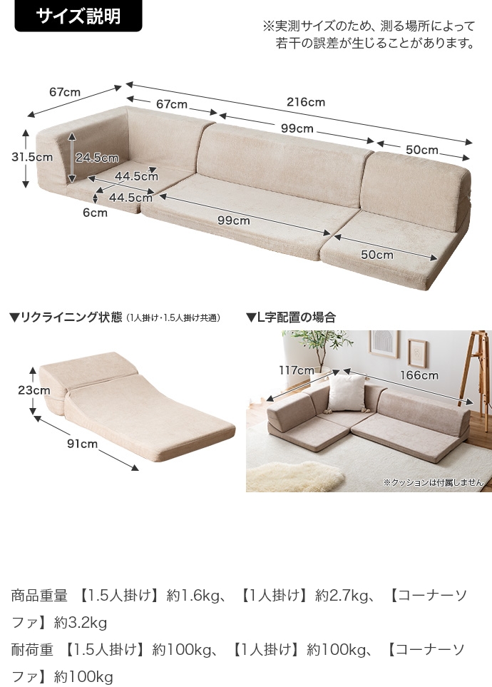 | サイズ | 1.5人掛け:幅99cm×奥行67cm×高さ31.5cm(座面高:6cm) 1人掛け:幅50cm×奥行67cm×高さ31.5cm(座面高:6cm) コーナー:幅67cm×奥行67cm×高さ31.5cm(座面高:6cm) |