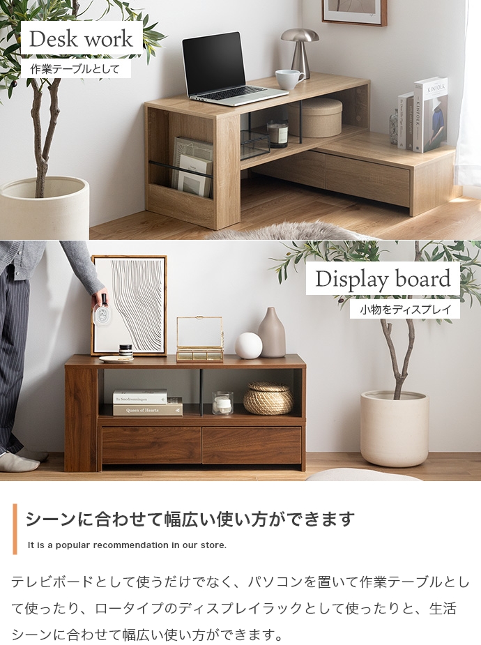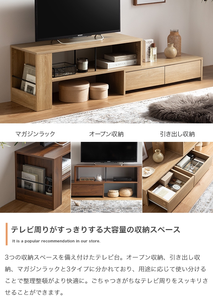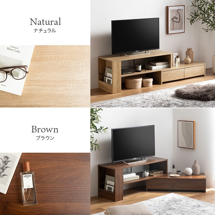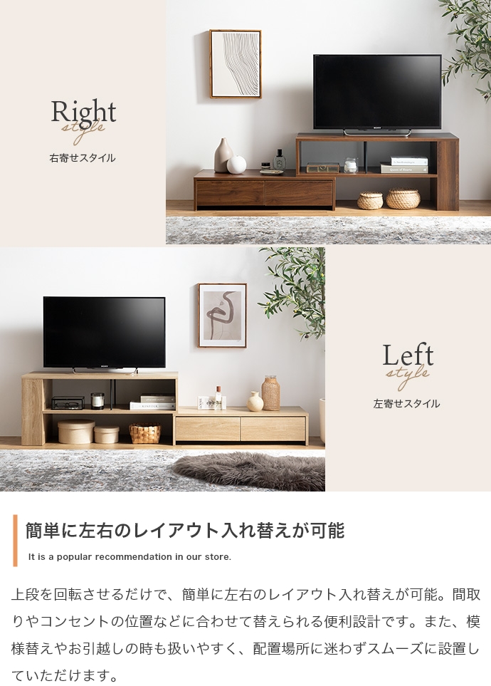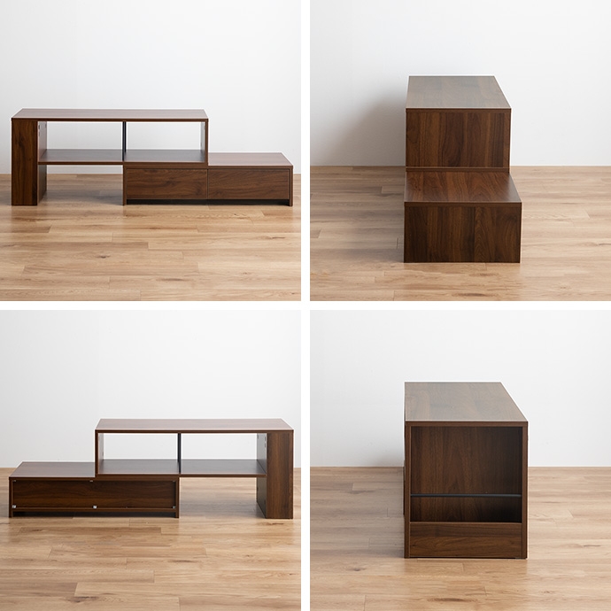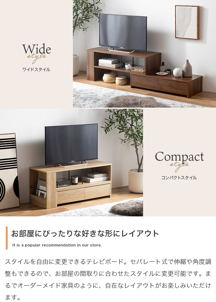 お部屋の大きさや間取りに合わせて自由自在にレイアウトできる伸縮テレビ台。セパレート式で横幅と角度の調節や左右を組み替えることもでき、お好きなスタイルを楽しむことが可能です。また、一人暮らしやワンルームにも置きやすいコンパクトデザインで、様々なお部屋に馴染みます。