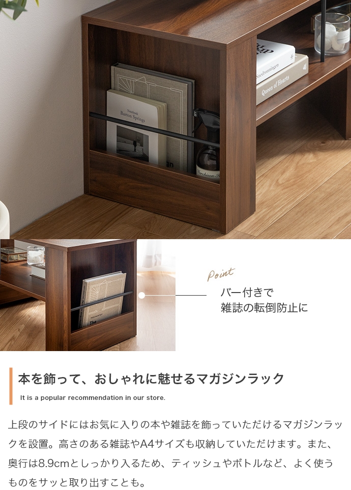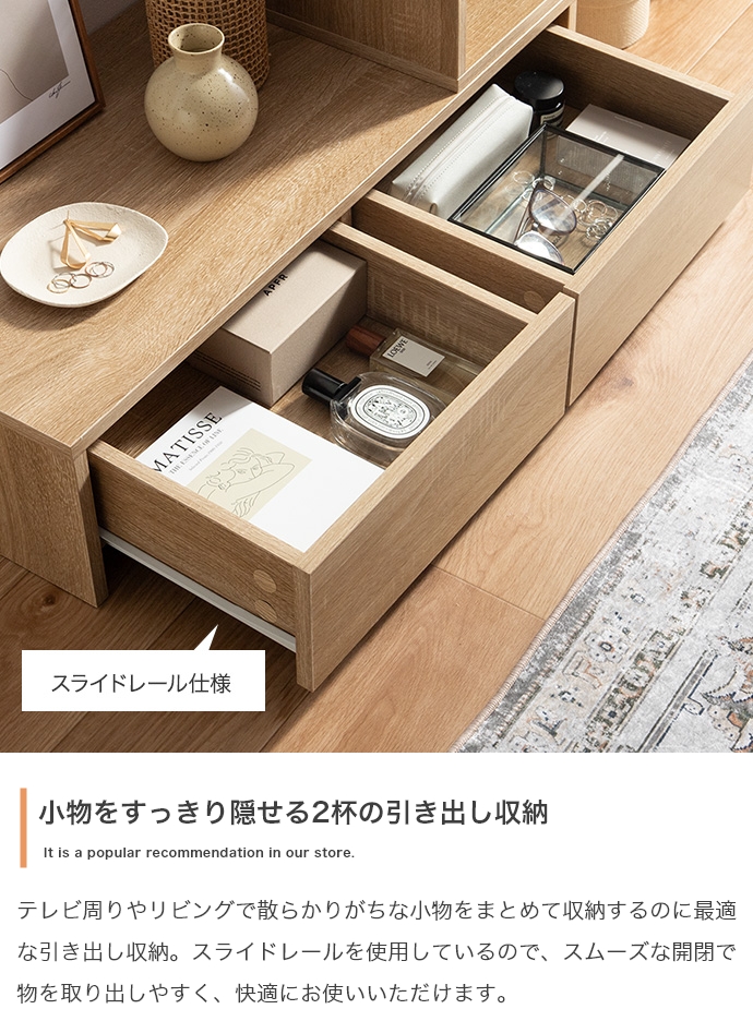 | 備考 | 【梱包サイズ】98.5cm×45cm×16.1cm 【梱包重量】約24kg 【商品重量】約21kg 【耐荷重】天板(上棚):約10kg、天板(下棚):約10kg、オープン収納:約10kg、引き出し:約3kg、マガジンラック:約3kg ※組み立て時間:2人以上で約60分 ※プラスドライバーをご用意ください。 |