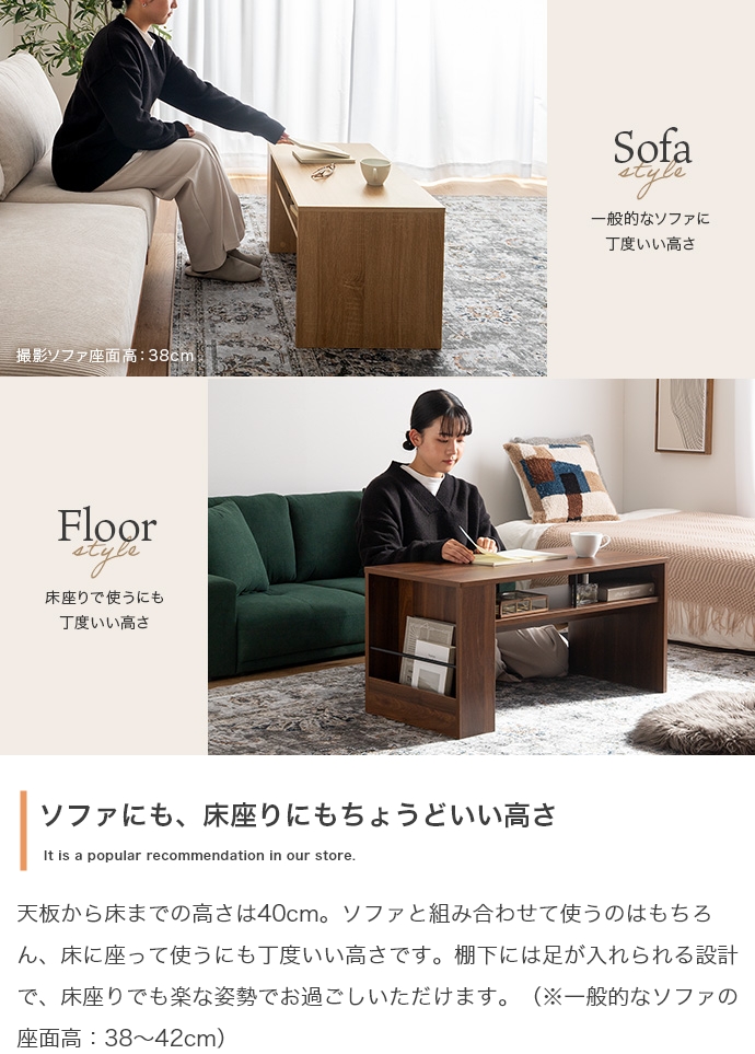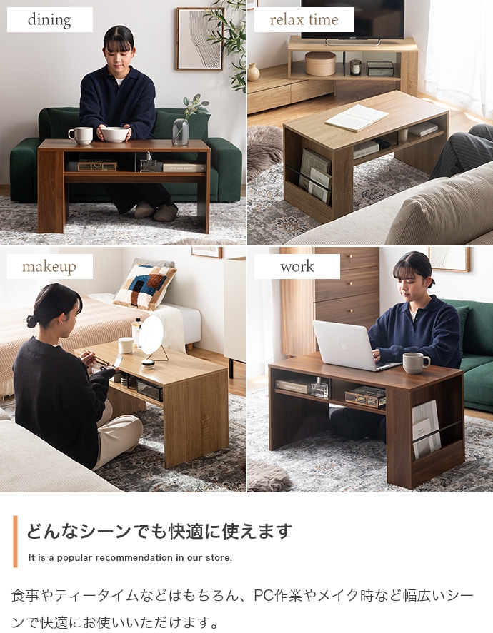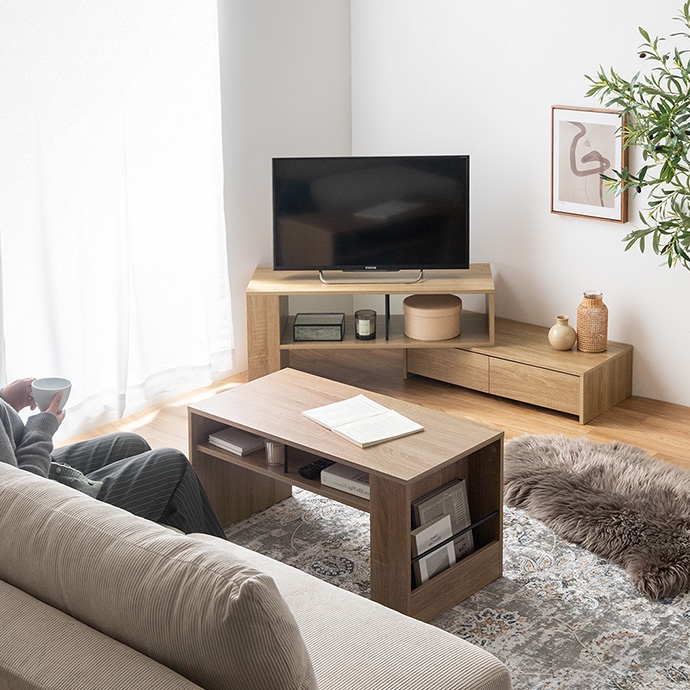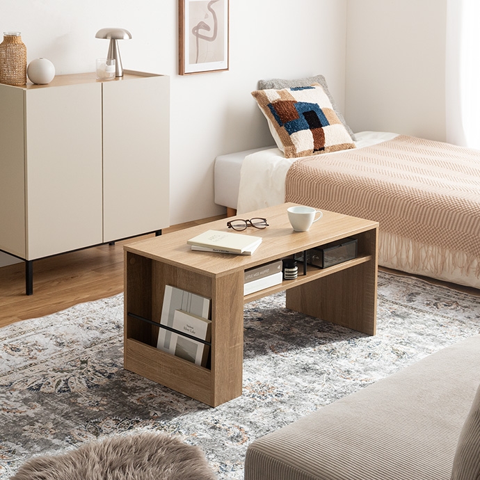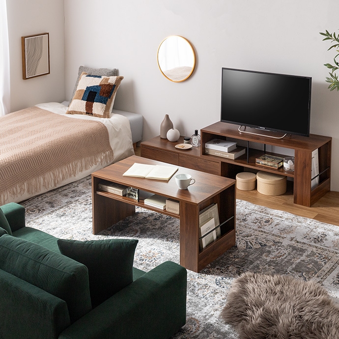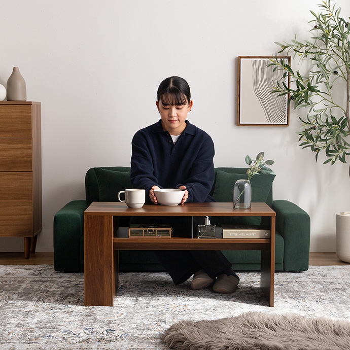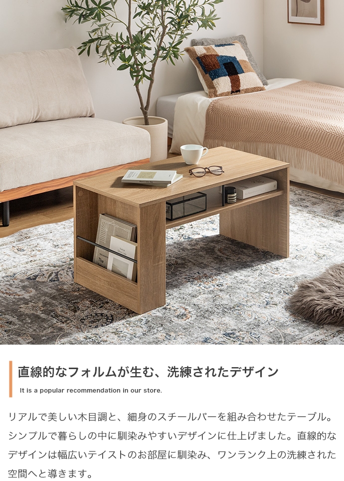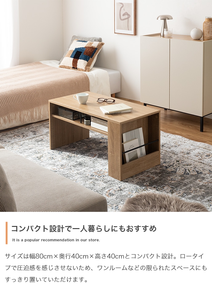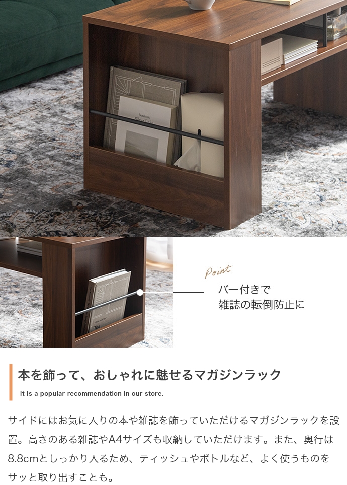美しさと機能性を備え、お部屋に上質感と快適さをプラスする収納付きセンターテーブル。天板下の便利な収納が、散らかりやすいテーブル上をすっきり保ちます。また、サイドには好きな雑誌を飾れるマガジンラック付き。ロータイプのためお部屋に圧迫感を与えず、ワンルームにもピッタリです。