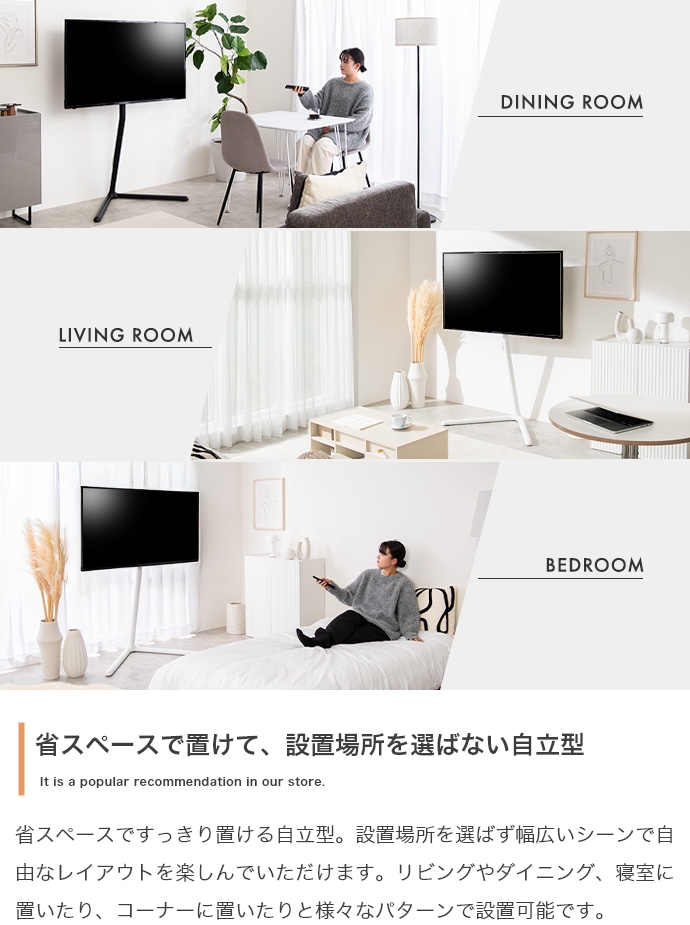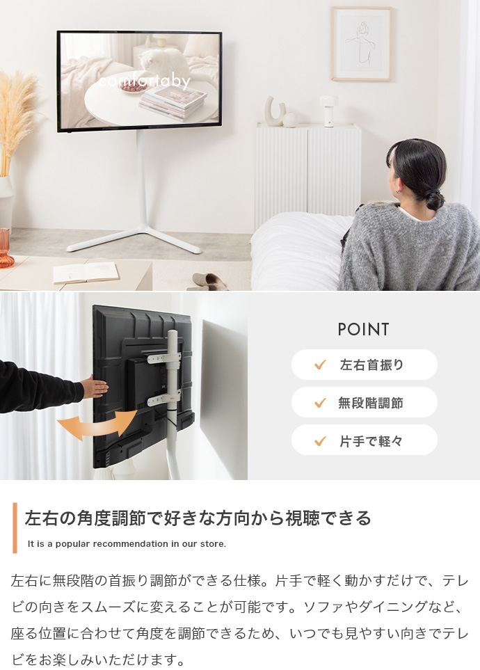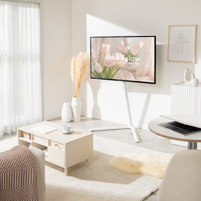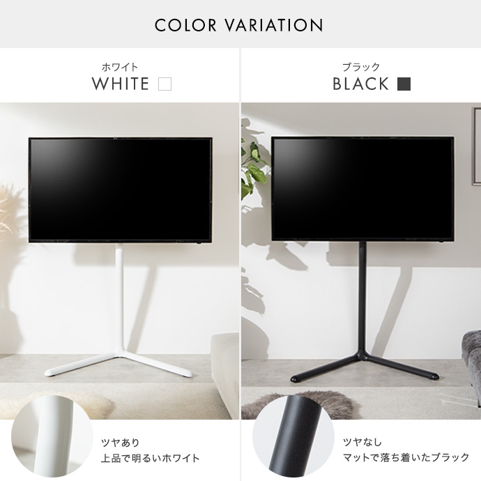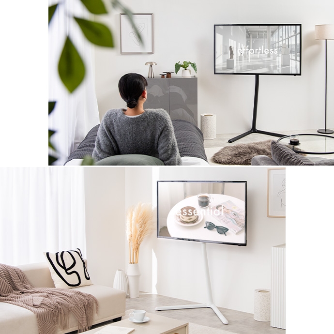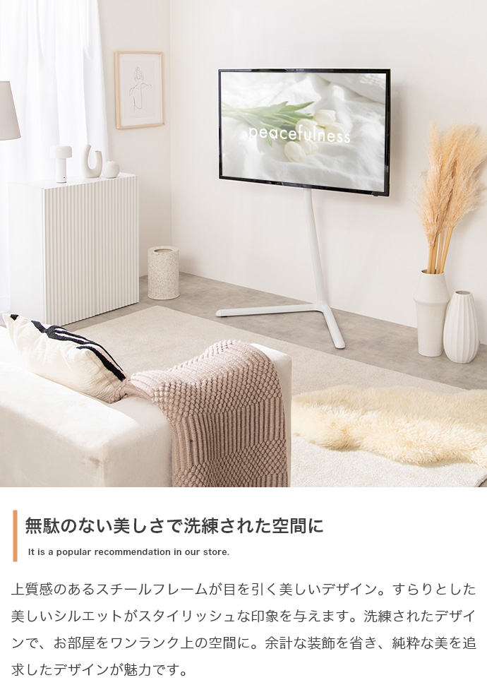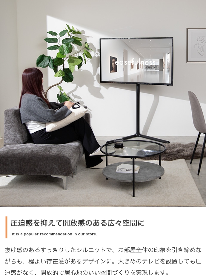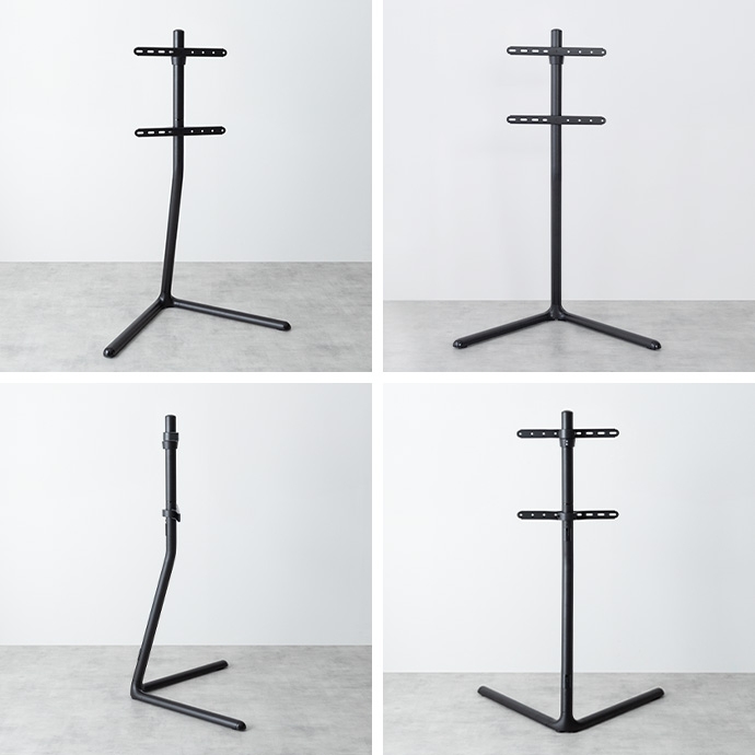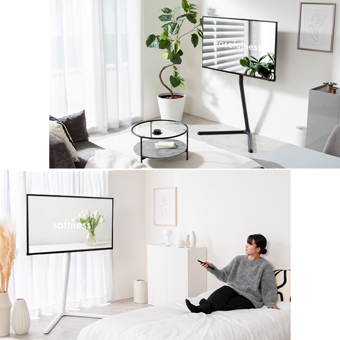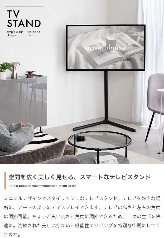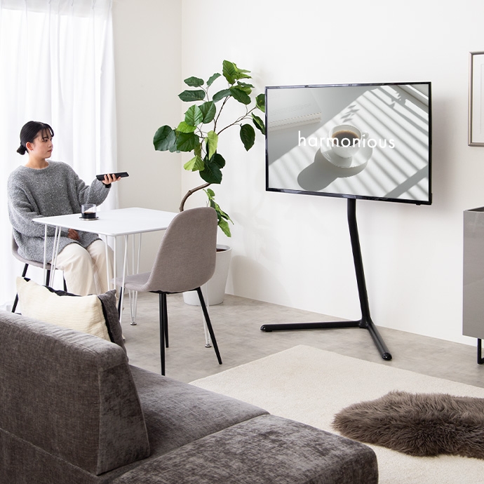 ミニマルデザインでスタイリッシュなテレビスタンド。テレビを好きな場所に、アートのようにディスプレイできます。またテレビの高さと、左右の角度は調節可能。ちょうど良い高さと角度に調節できるため、日々の生活を快適に。洗練された美しい佇まいと機能性でリビング空間を特別な空間にしてくれます。