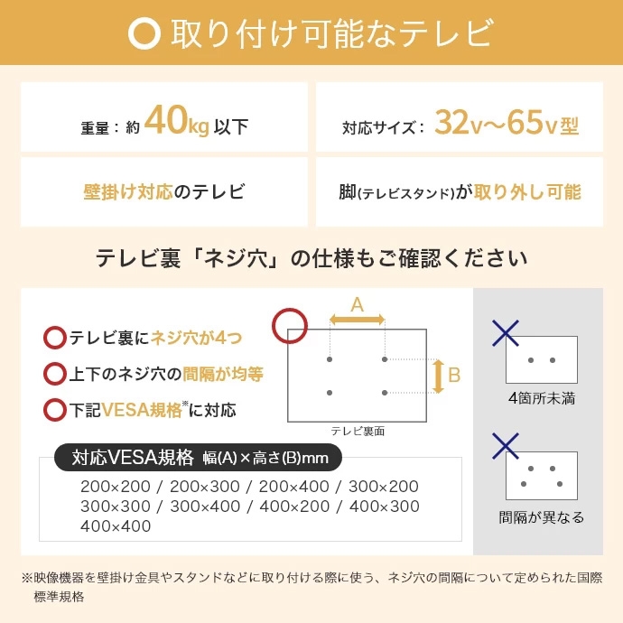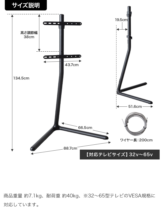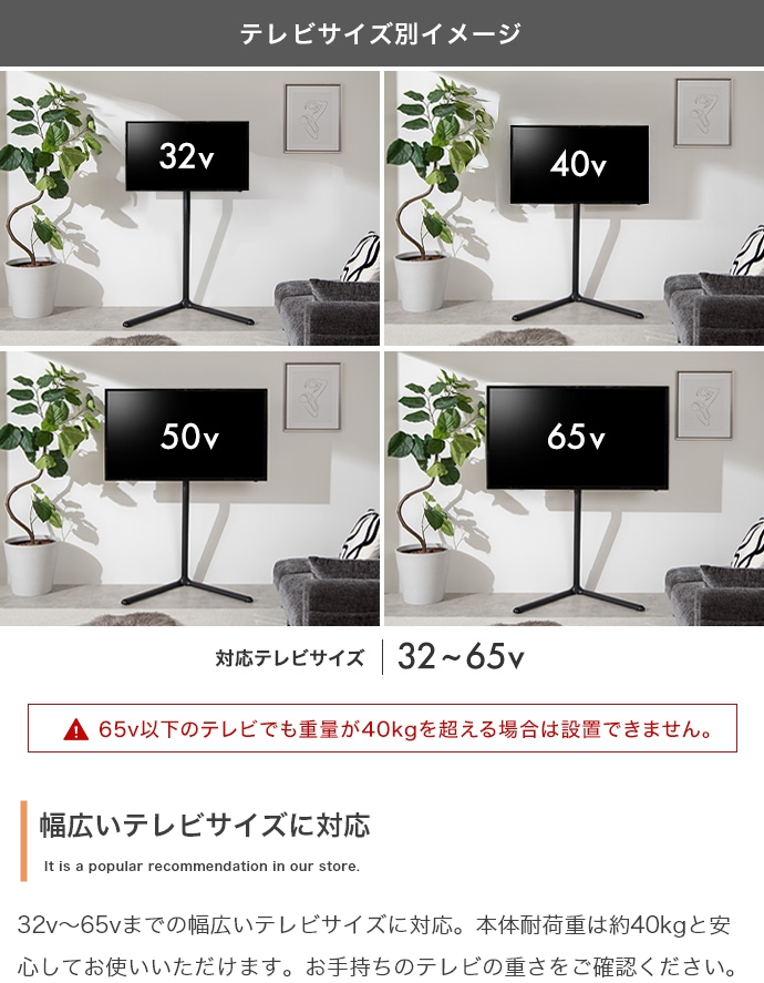 | 備考 | 【梱包サイズ】106cm×28.5cm×20cm 【梱包重量】約8.3kg 【商品重量】約7.1kg 【耐荷重】約40kg ※組み立て時間:2人以上で約30分(テレビ設置時間は含まず) ※付属工具のほか、プラスドライバーをご用意ください。 ※32~65型テレビのVESA規格に対応しています。 ※この商品には転倒防止金具が付属しています。 ※転倒防止金具の取り付けについて:地震や事故による万一の転倒、落下によるケガや製品の破損等は弊社では保障できかねます。特に小さいお子様のいらっしゃるご家庭では壁に寄せて、転倒防止金具をご使用ください。 ※商品の購入・使用から生じた損害に対して、当店はその責任(金銭的補償等)を負うことが出来かねます。 |