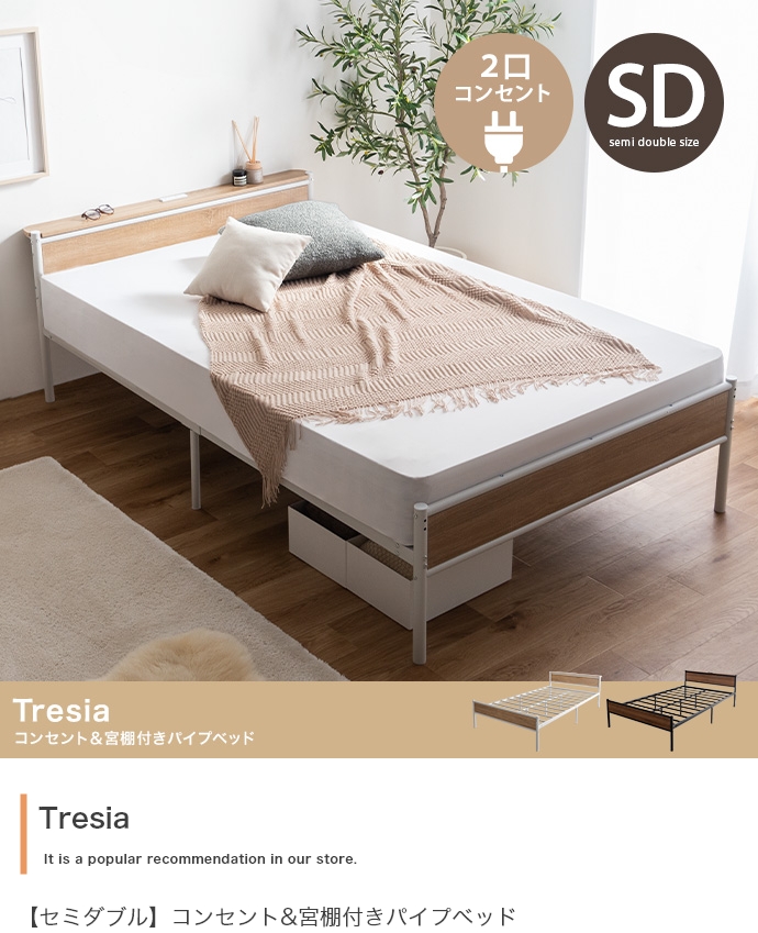 【セミダブル】コンセント&宮棚付きパイプベッド
