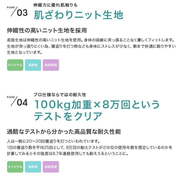 | サイズ | 【フレーム】 幅120cm×奥行209.3cm×高さ63cm 【マットレス】 [オリジナルポケットコイルマットレス(セミダブル)] 幅120cm×奥行195cm×高さ17cm(コイル数:570) [高密度アドバンスポケットコイルマットレス(セミダブル)] 幅120cm×奥行195cm×高さ20cm(コイル数:665) [超高密度ハイグレードポケットコイルマットレス(セミダブル)] 幅120cm×奥行195cm×高さ22cm(コイル数:1664) |