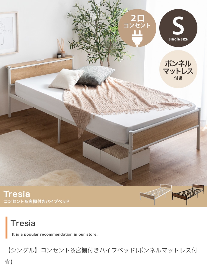 【シングル】コンセント&宮棚付きパイプベッド(ボンネルマットレス付き)