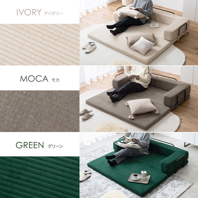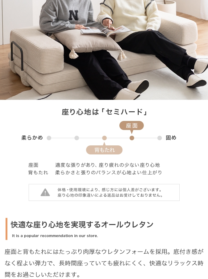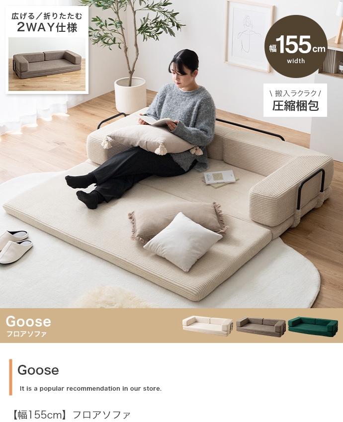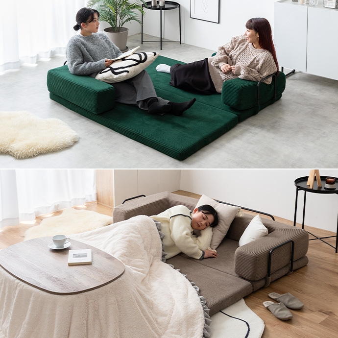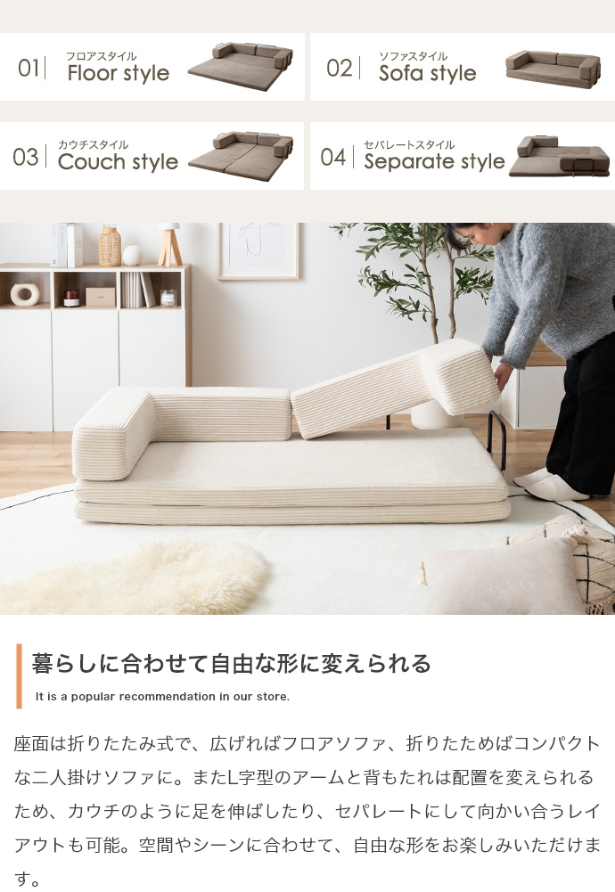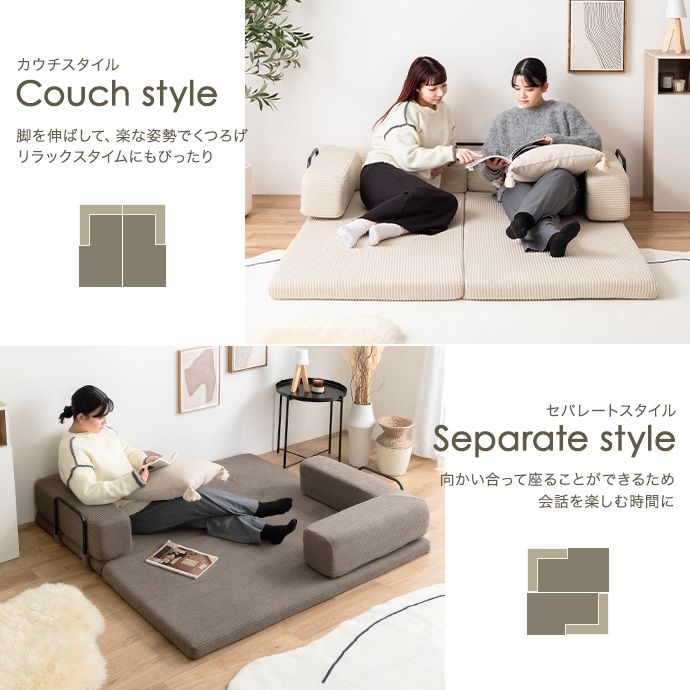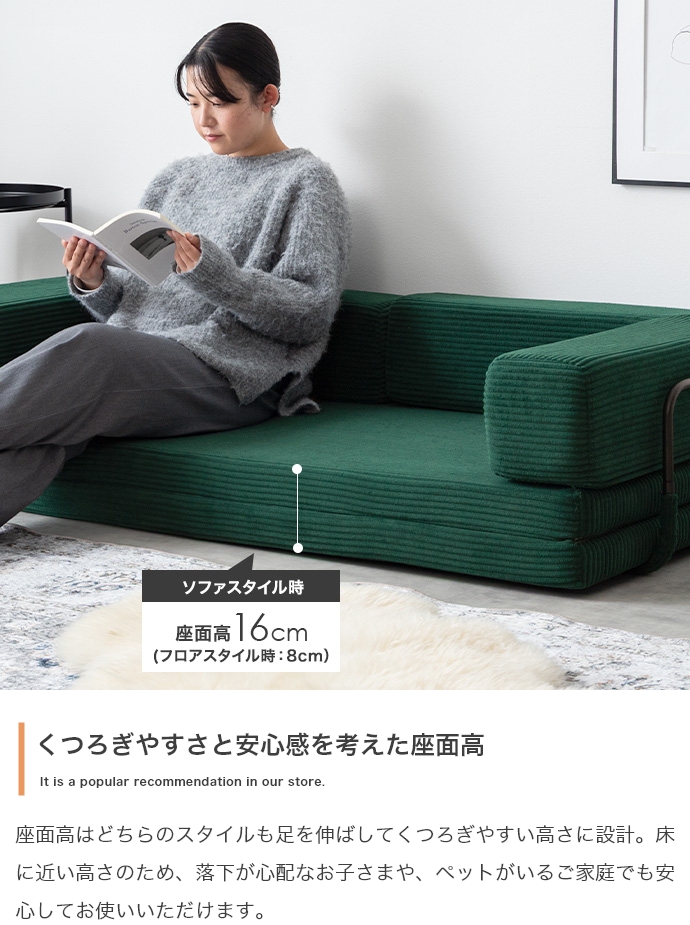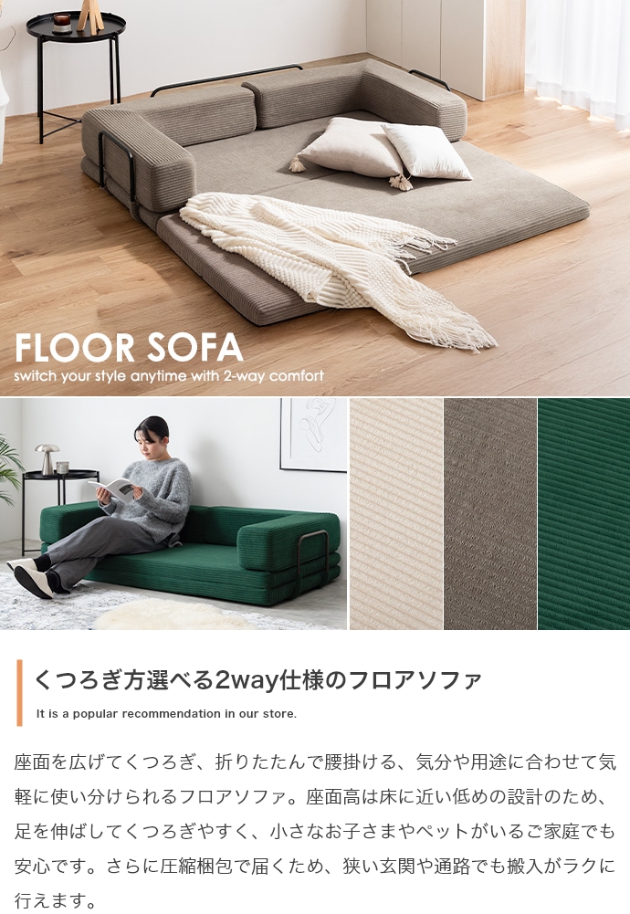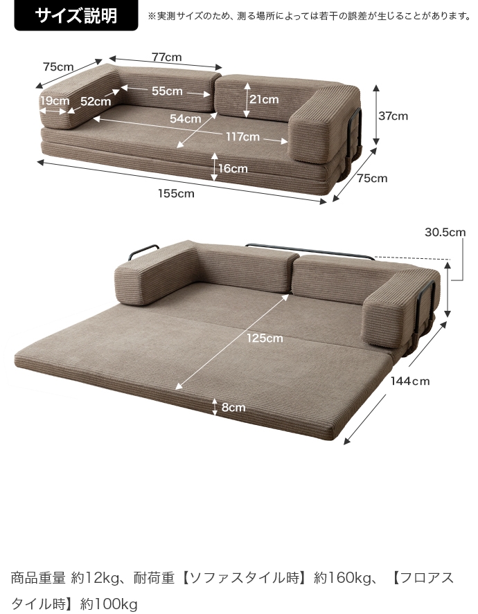 | サイズ | 【ソファスタイル時】幅155cm×奥行75cm×高さ37cm(座面高:16cm) 【フロアスタイル時】幅155cm×奥行144cm×高さ30.5cm(座面高:8cm) |