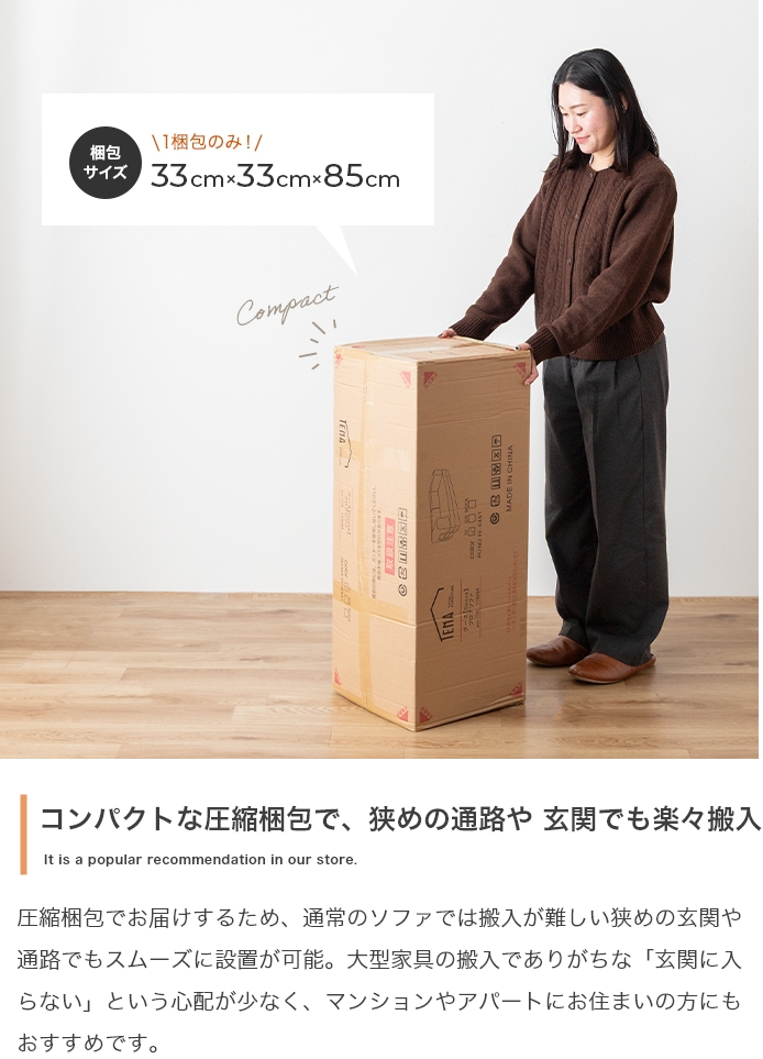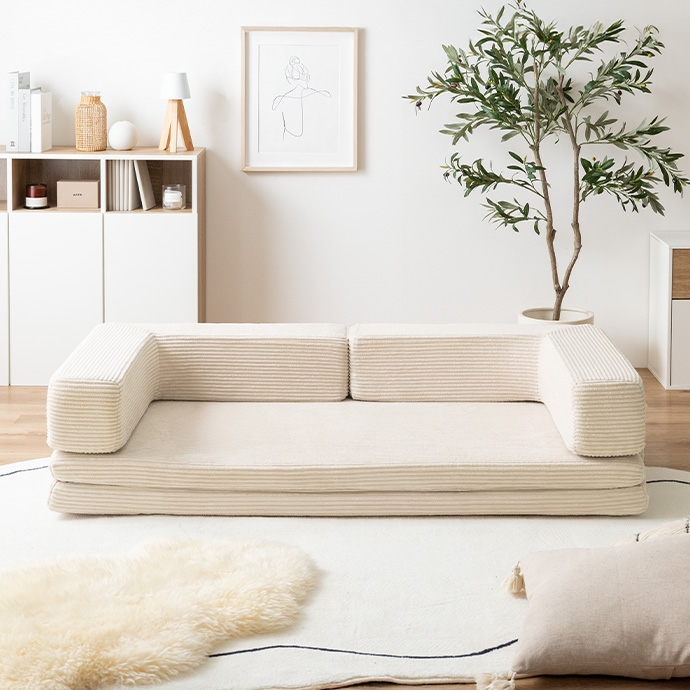 座面を広げてくつろぎ、折りたたんで腰掛ける、気分や用途に合わせて気軽に使い分けられるフロアソファ。座面高は床に近い低めの設計のため、足を伸ばしてくつろぎやすく、小さなお子さまやペットがいるご家庭でも安心です。さらに圧縮梱包で届くため、狭い玄関や通路でも搬入がラクに行えます。