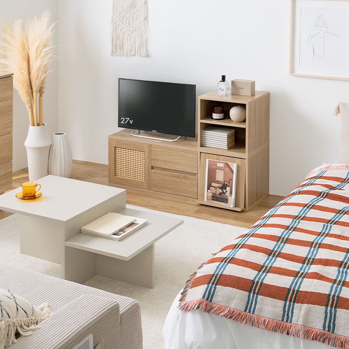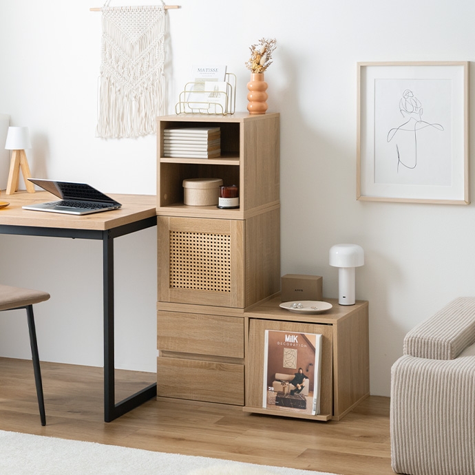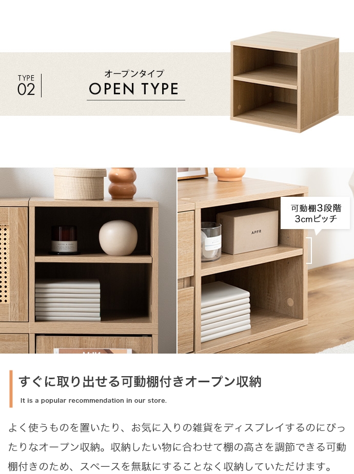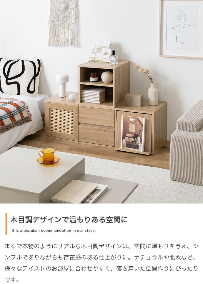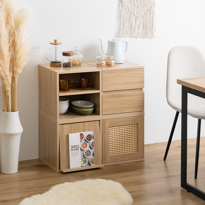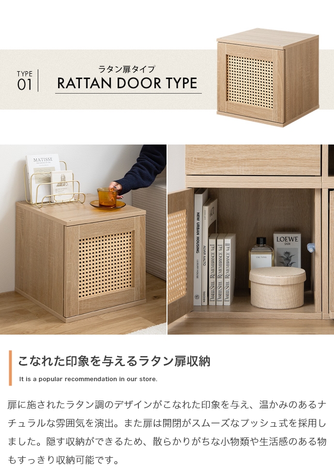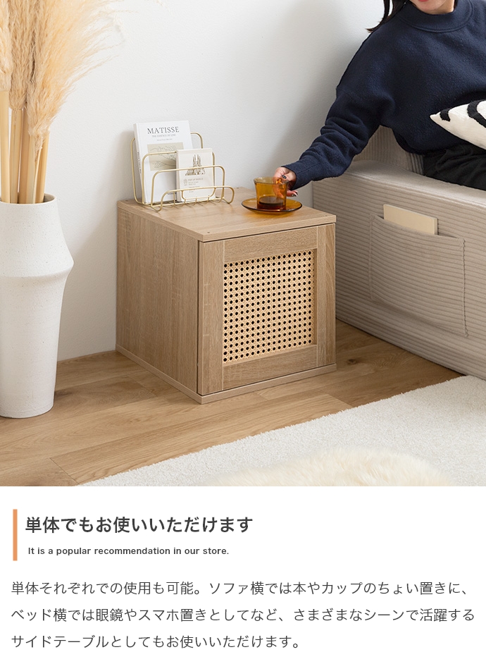 | サイズ | 【ラタン扉】幅35cm×奥行35cm×高さ35cm 【オープン】幅35cm×奥行35cm×高さ35cm 【引き出し】幅35cm×奥行35cm×高さ35cm 【フラップ扉】幅35cm×奥行40.5cm×高さ35cm |