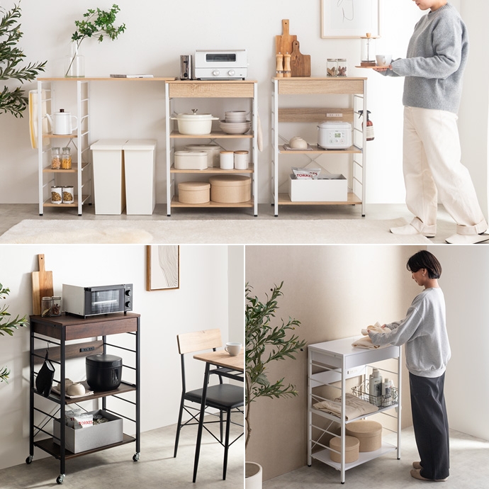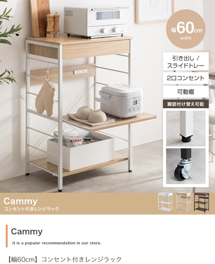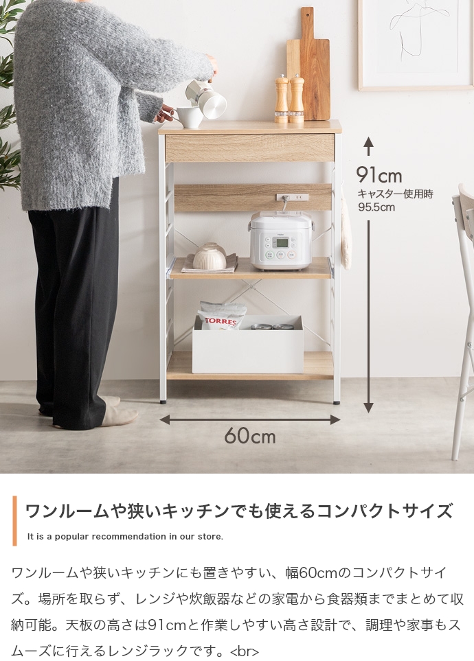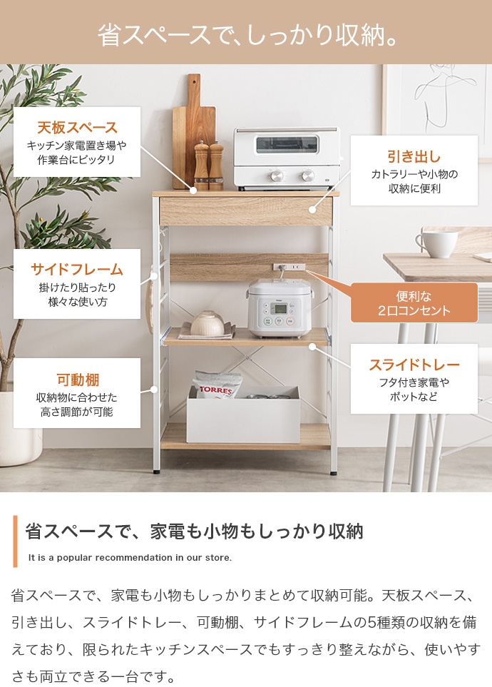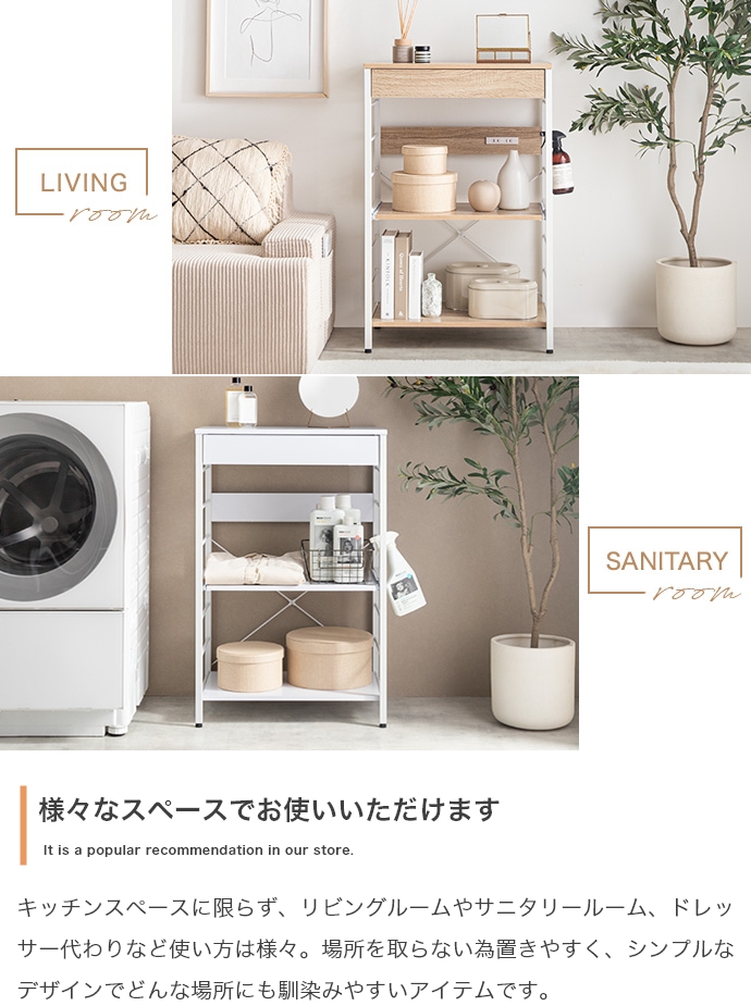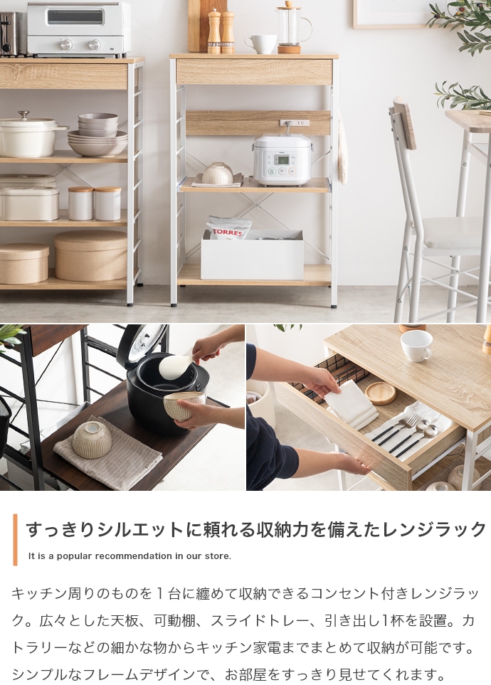 キッチン周りのものを1台に纏めて収納できるコンセント付きレンジラック。広々とした天板、可動棚、スライド収納、引き出しを備えており、カトラリーなどの細かな物からキッチン家電までまとめて収納が可能。また幅60cmのコンパクト設計で、限られたスペースにも設置ができ、キッチンに限らず、リビングルームやサニタリールームなど様々な場所で活用いただけます。