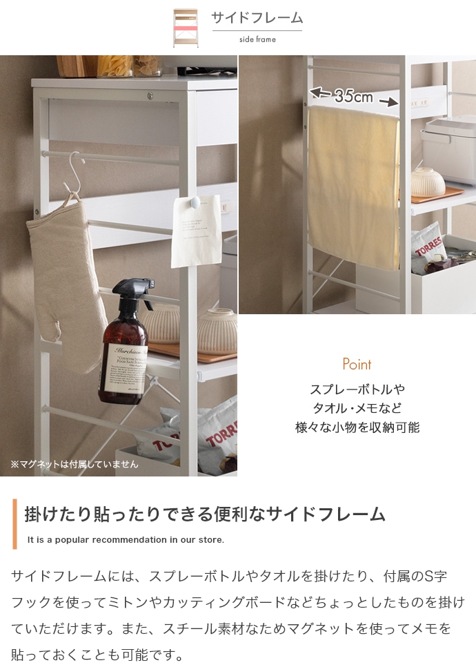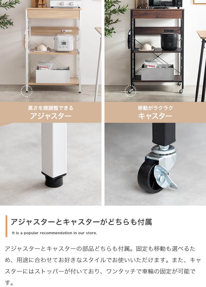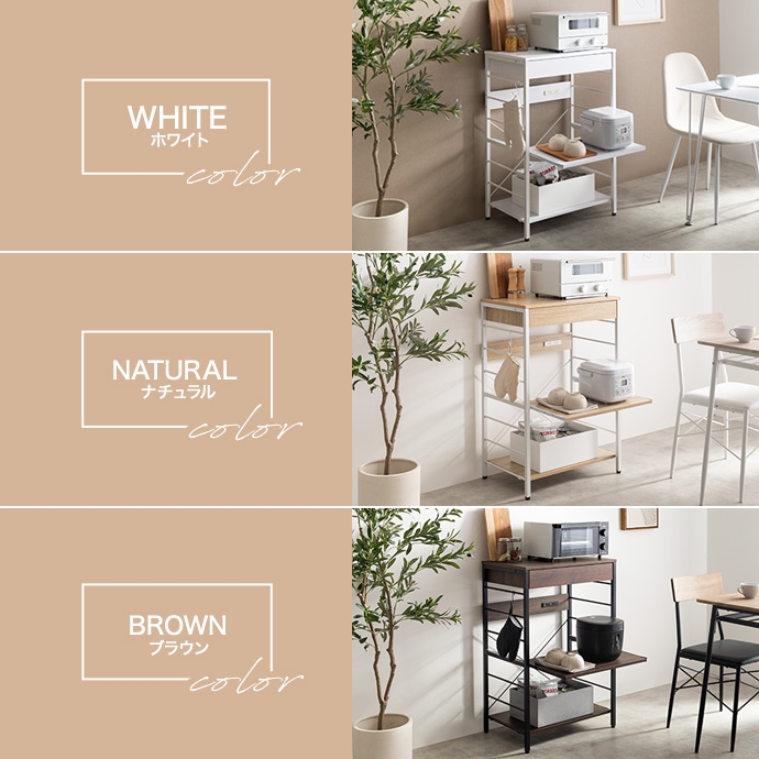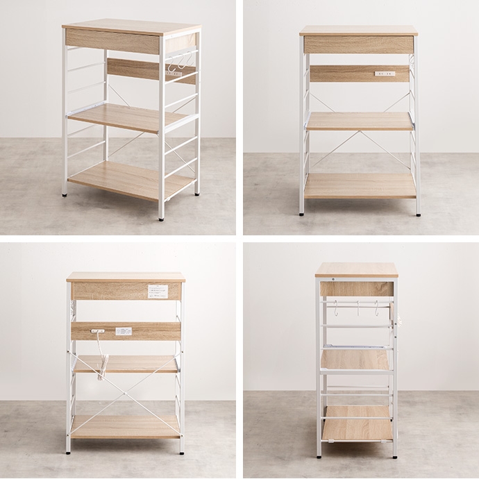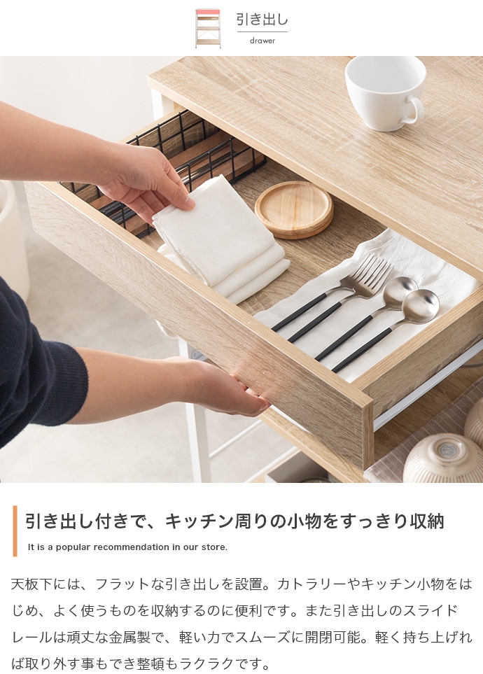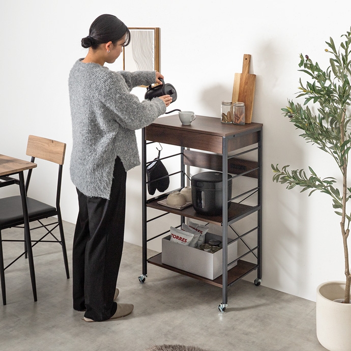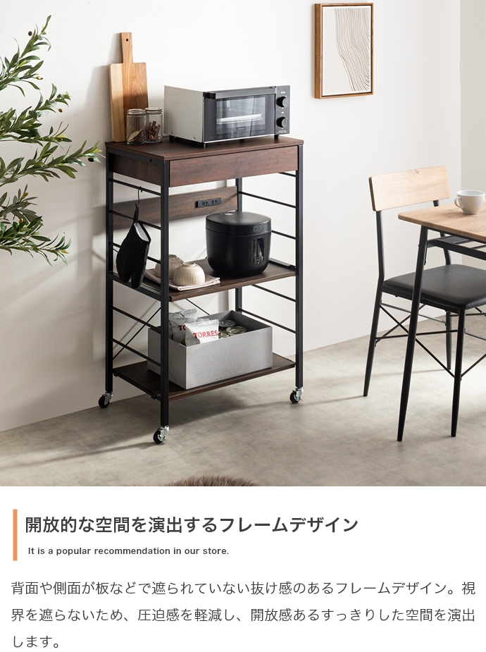 キッチン周りのものを1台に纏めて収納できるコンセント付きレンジラック。広々とした天板、可動棚、スライド収納、引き出しを備えており、カトラリーなどの細かな物からキッチン家電までまとめて収納が可能。また幅60cmのコンパクト設計で、限られたスペースにも設置ができ、キッチンに限らず、リビングルームやサニタリールームなど様々な場所で活用いただけます。