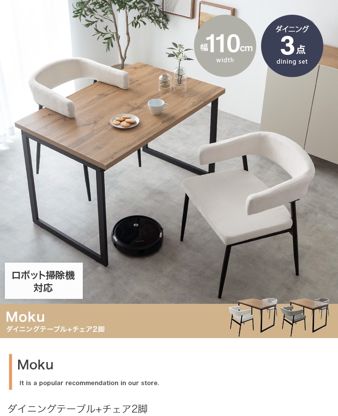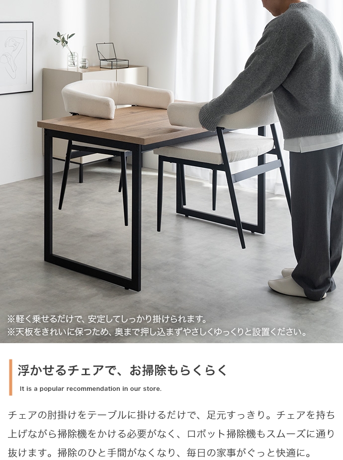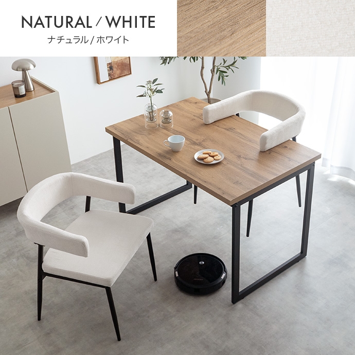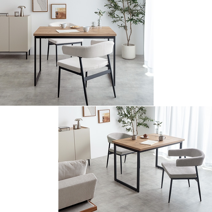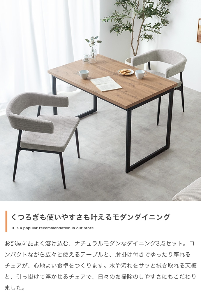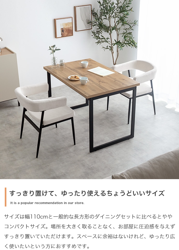 温もりのある木目とブラックスチールが調和した、ナチュラルモダンなダイニング3点セット。幅110cmのテーブルは2人で広々と使え、作業スペースとしても十分な広さとなっております。セットのチェアは背もたれと一体になった肘掛けが体を優しく支える設計。ハンギング可能な仕様で、床掃除やロボット掃除機の使用も快適です。お部屋に圧迫感を与えず、上質なインテリア空間を叶えます。