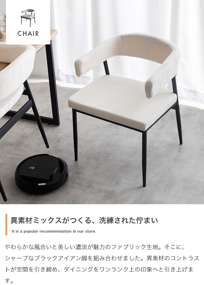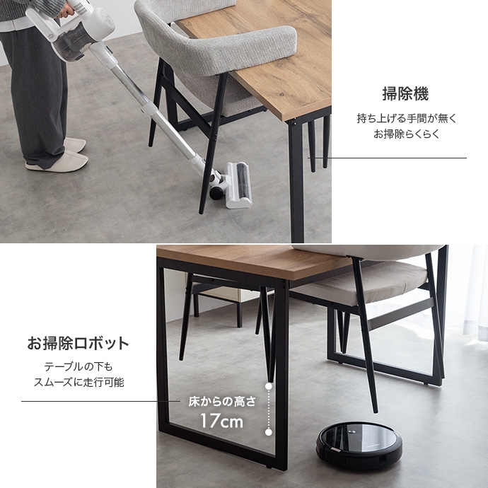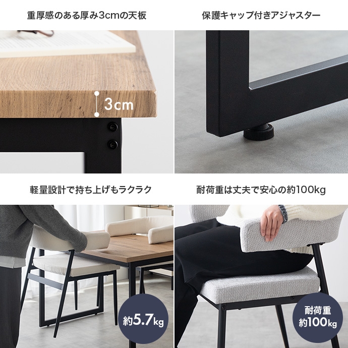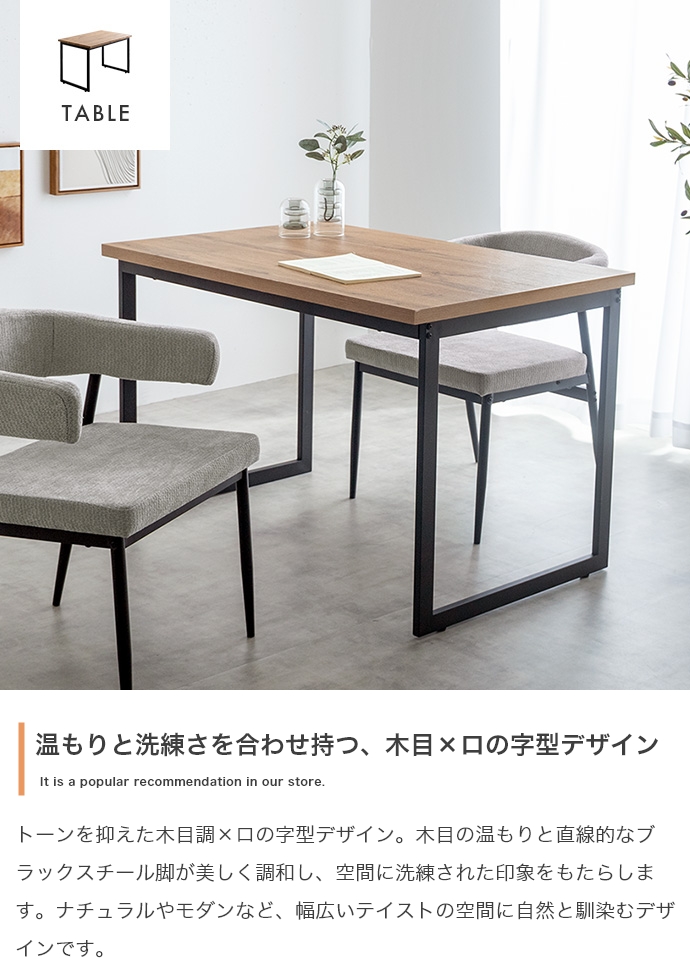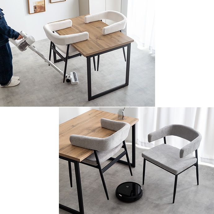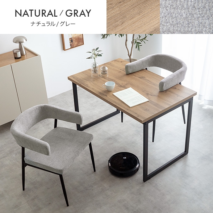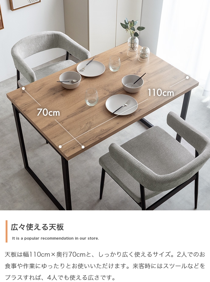 温もりのある木目とブラックスチールが調和した、ナチュラルモダンなダイニング3点セット。幅110cmのテーブルは2人で広々と使え、作業スペースとしても十分な広さとなっております。セットのチェアは背もたれと一体になった肘掛けが体を優しく支える設計。ハンギング可能な仕様で、床掃除やロボット掃除機の使用も快適です。お部屋に圧迫感を与えず、上質なインテリア空間を叶えます。