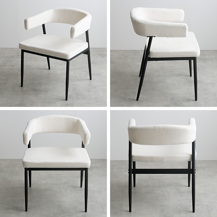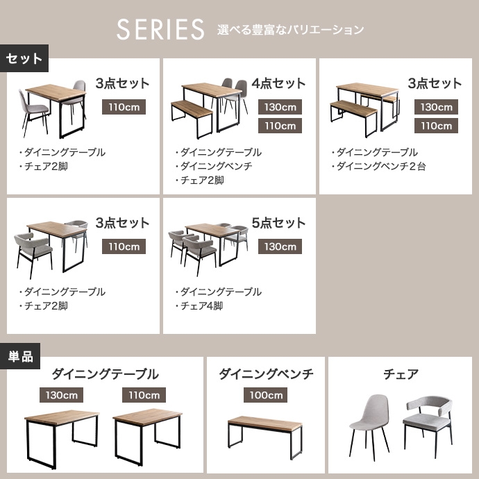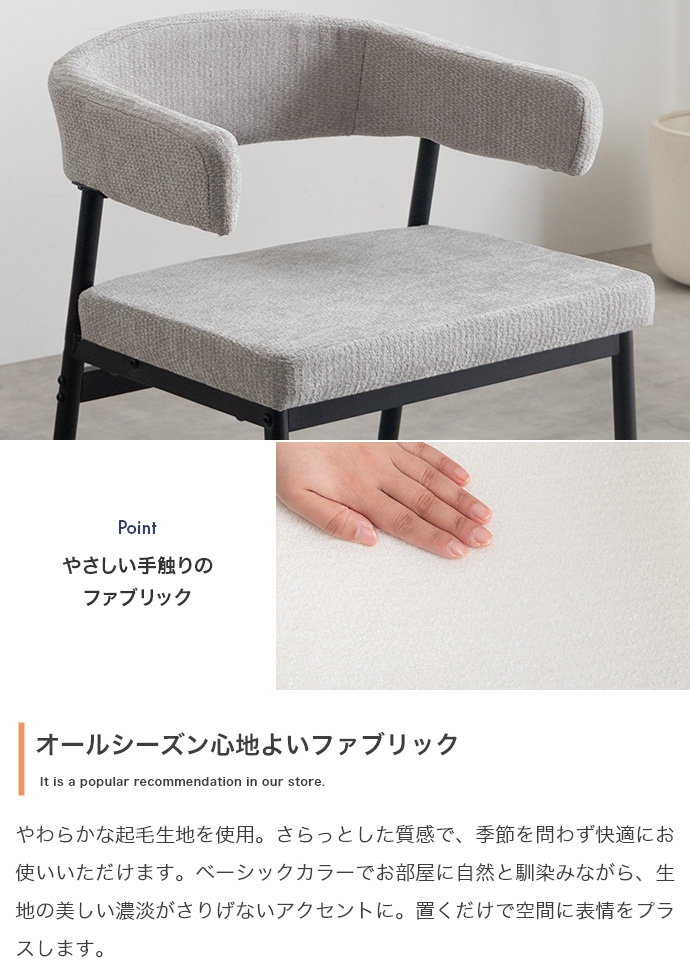 | 素材 | 【テーブル】MDF(PVC貼り) 【チェア】本体:パーティクルボード、ウレタンフォーム、張地:ファブリック 【テーブル】スチール(粉体塗装) 【チェア】スチール(粉体塗装) |