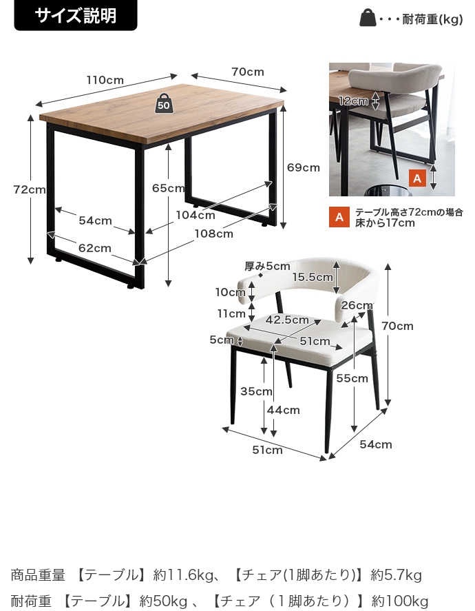 | サイズ | 【テーブル】幅110cm×奥行70cm×高さ72cm 【チェア】幅51cm×奥行54cm×高さ70cm(座面高:44cm) |